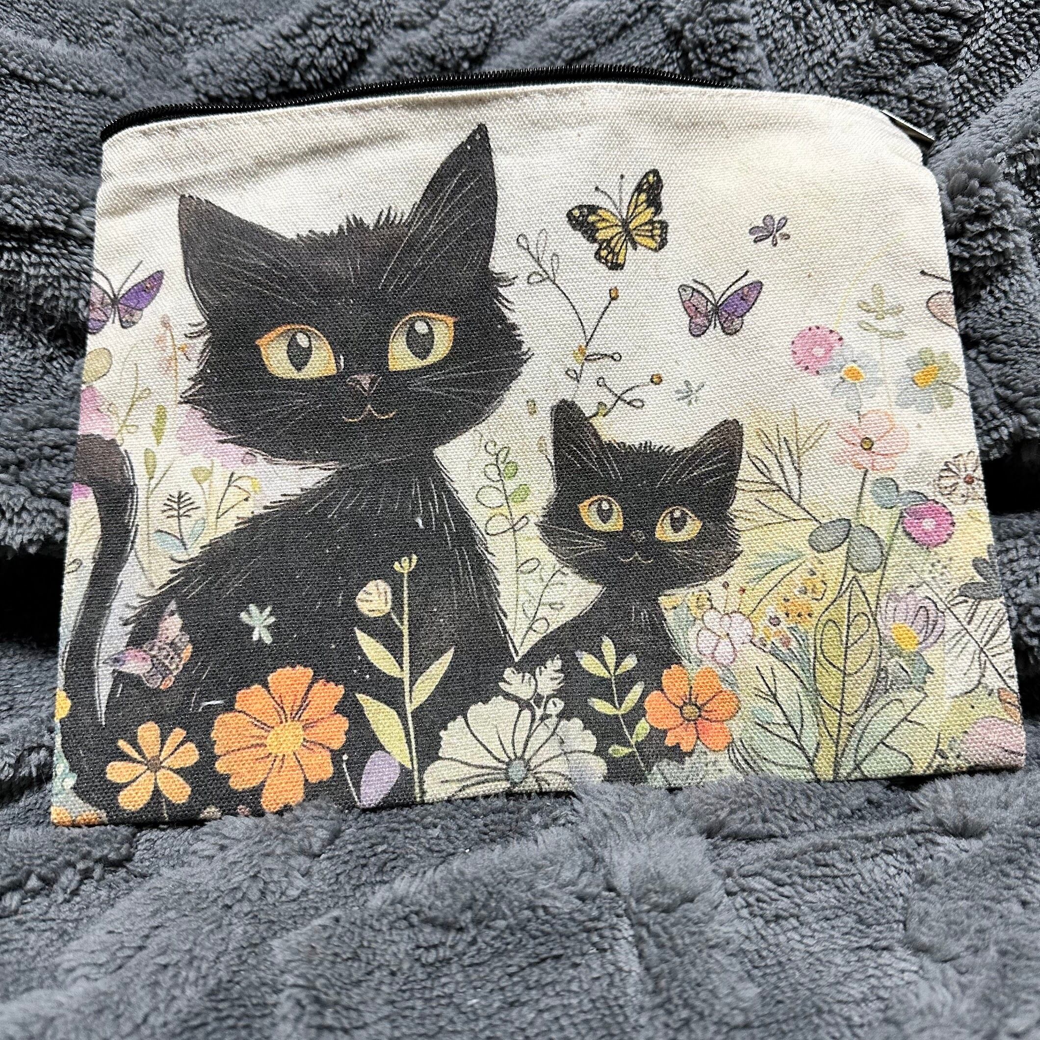 黒猫親子のアートポーチ|蝶と花が舞う癒しの両面デザイン