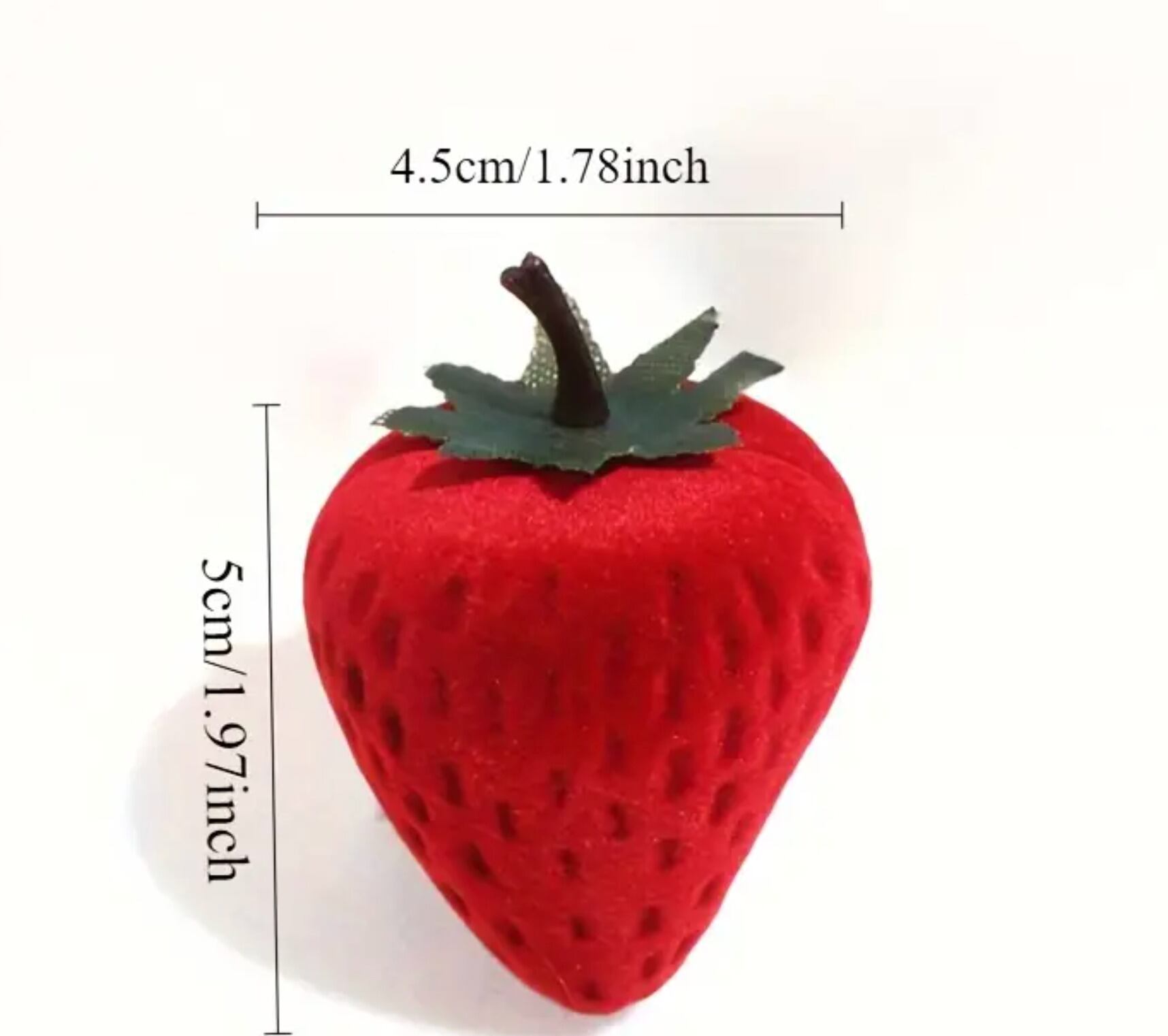 まるで本物のイチゴのように愛らしいデザインのリングボックスです。鮮やかな赤いベルベットがイチゴの質感を再現し、ヘタ部分もポイント。