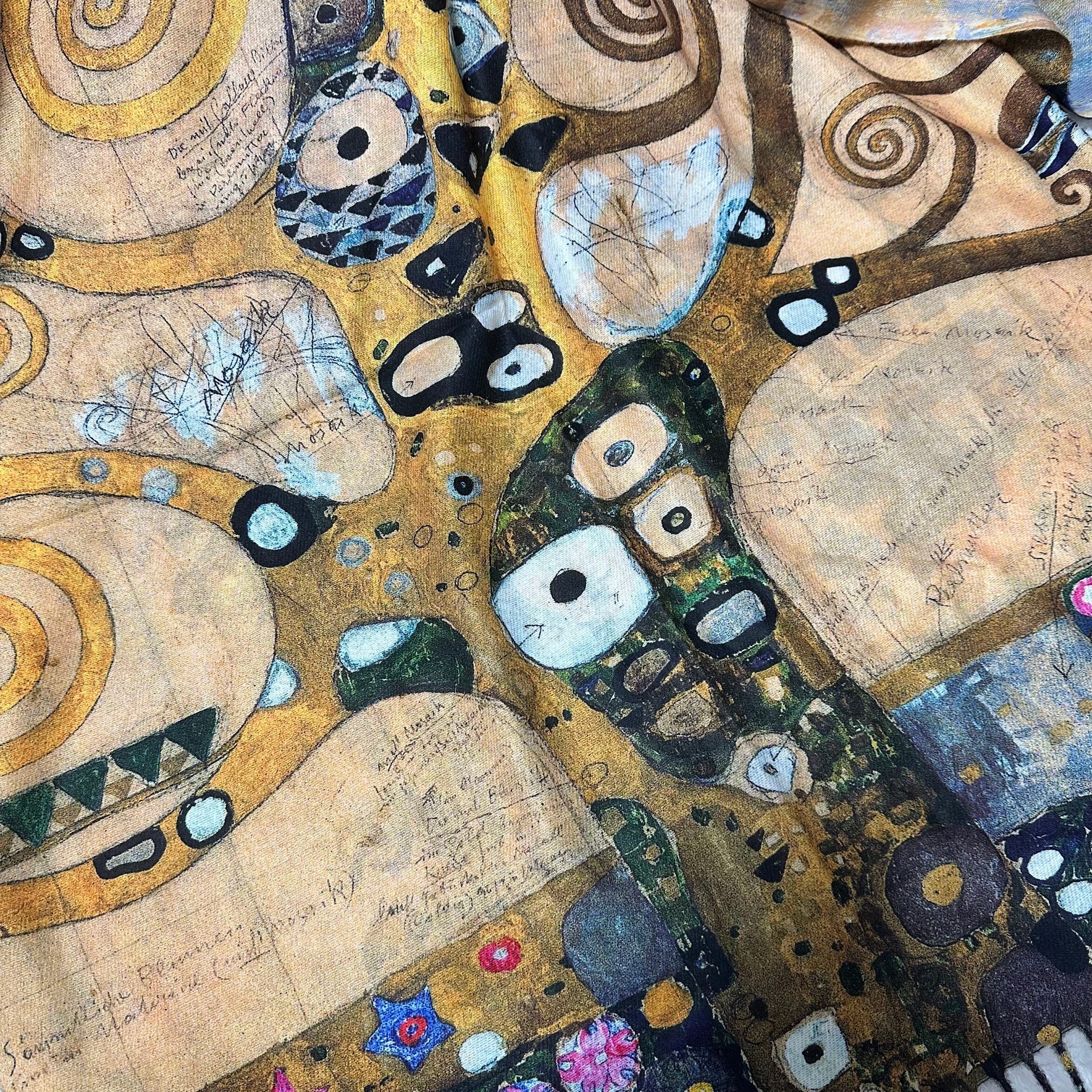 その名作《生命の樹》と《抱擁(The Embrace)》を贅沢に両面にあしらった、カシミヤ風のストールです。