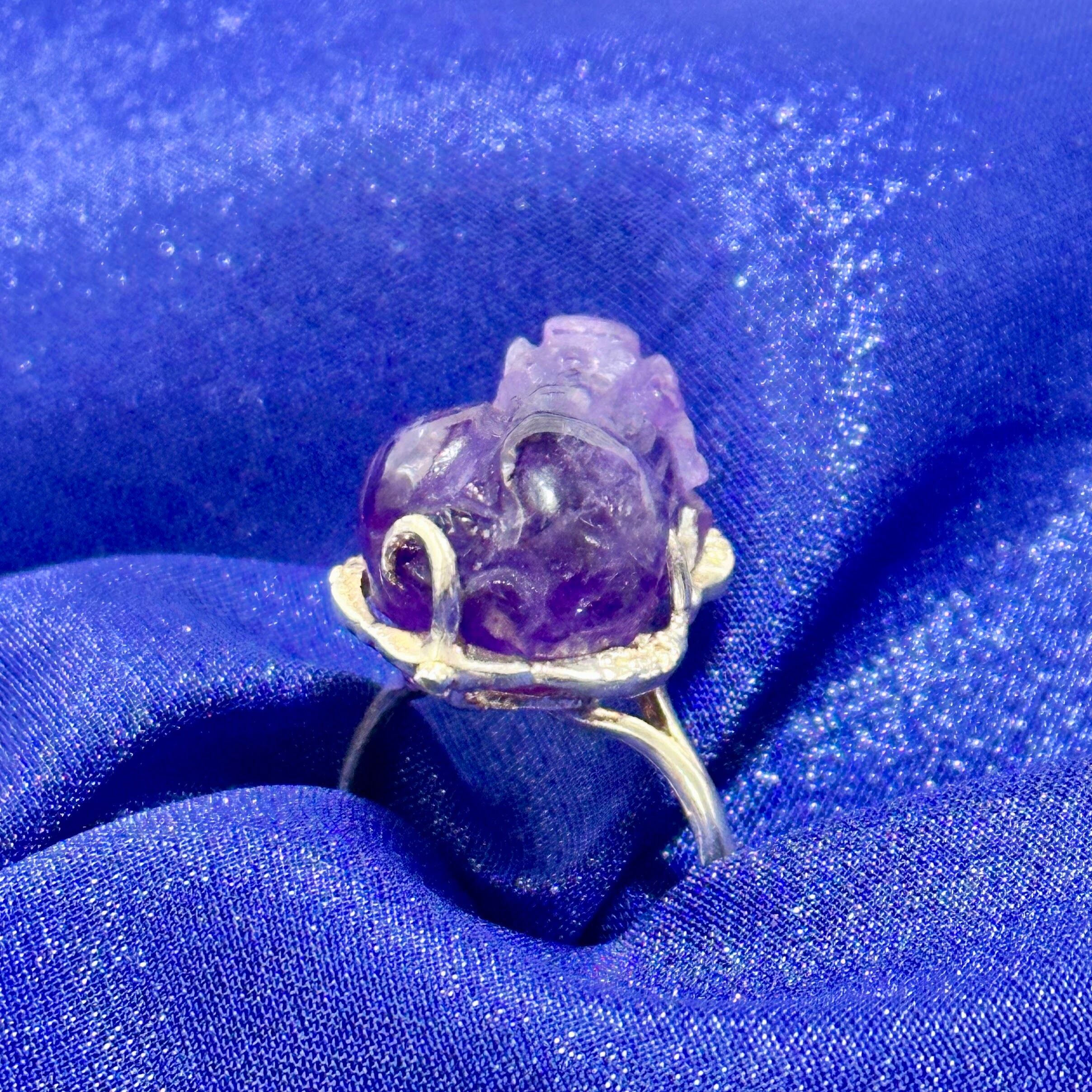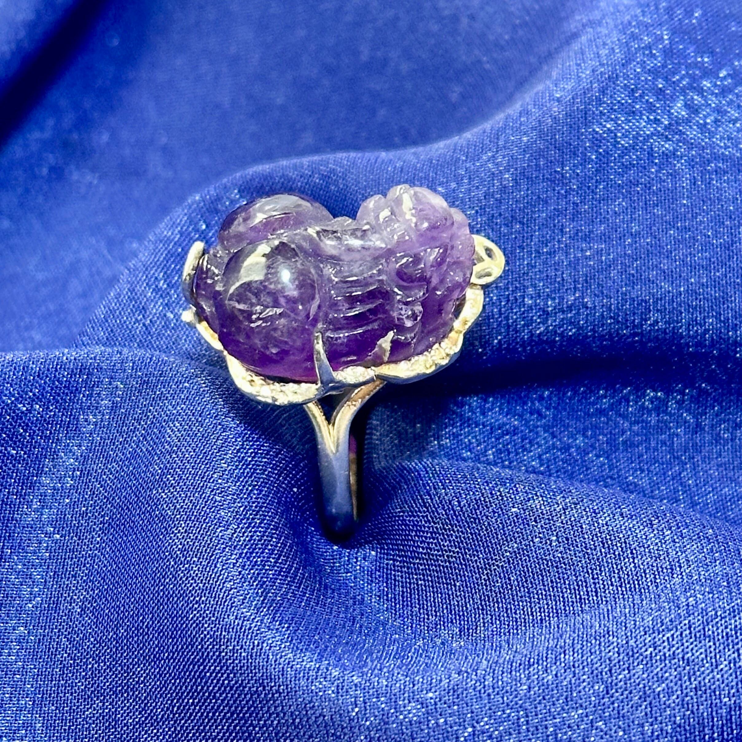 アメジストを丁寧に彫刻した貔貅(ひきゅう)を主役にした、金運と癒しを象徴する天然石リングです。もともと貔貅の置物として加工されることの多いビーズを、「指輪として身につけられたらもっと魅力が伝わるのでは」と考え、ジュエリー春日オリジナルのリング枠を制作しました。