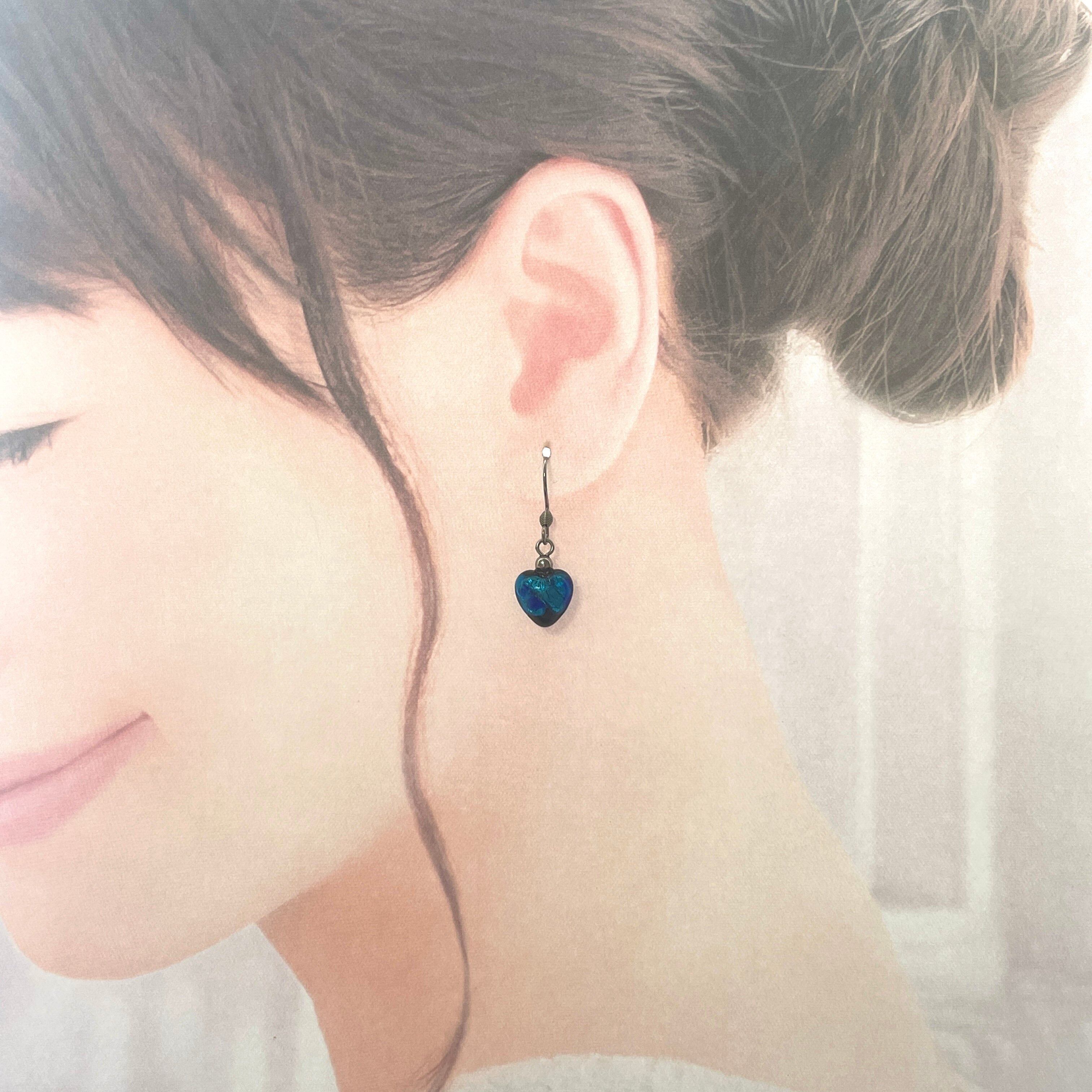 深く美しいブルーに銀箔のきらめきが閉じ込められた、ホタルガラスのハートピアスです。