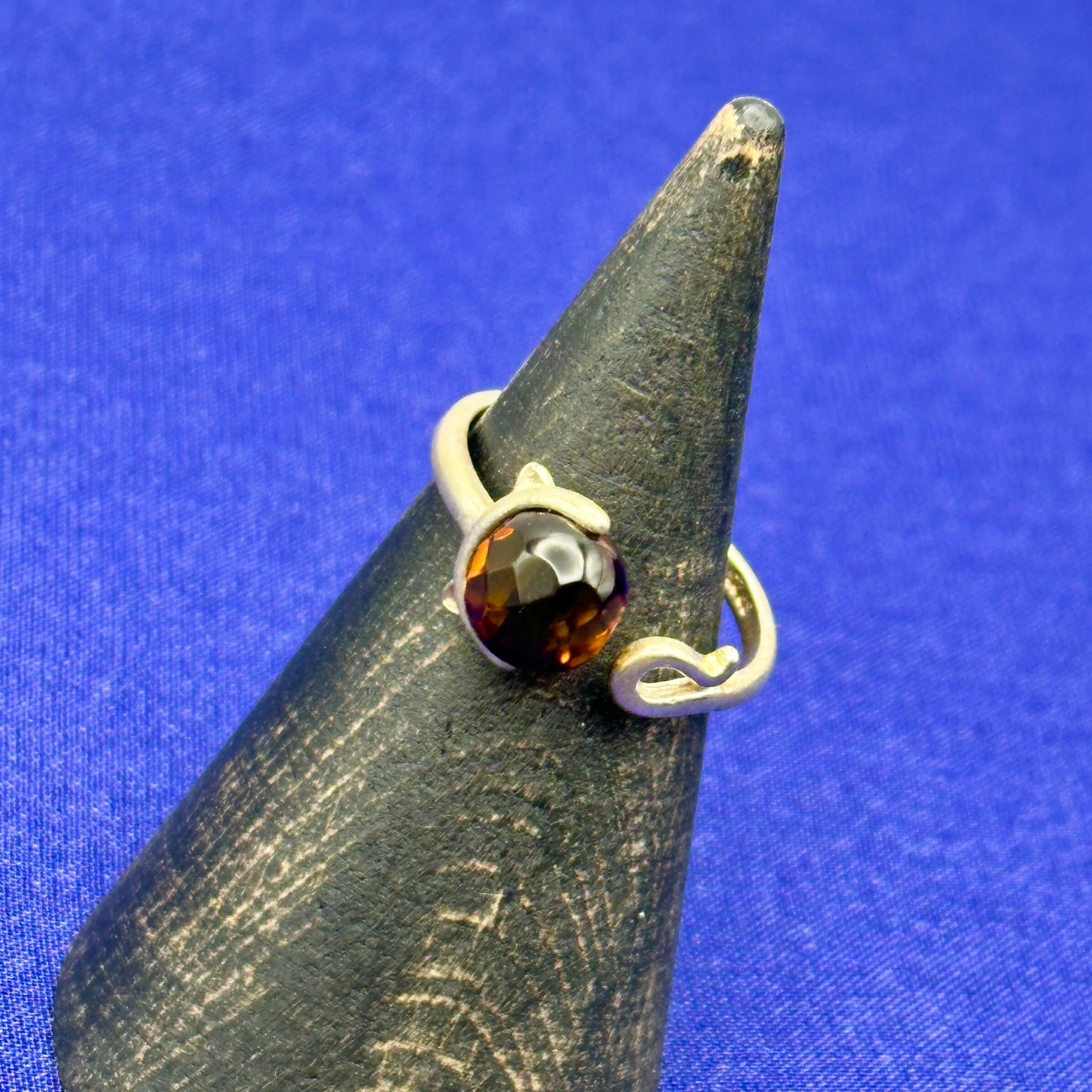 温かみのある黄金色の輝きを放つ、天然琥珀をあしらった猫耳デザインのリングです。カットを施した琥珀は、光を受けるたびに多彩な表情を見せ、角度によってキラキラと揺らめく美しさが魅力。まるで猫の瞳のように輝き、指先に遊び心と上品さを添えてくれます。