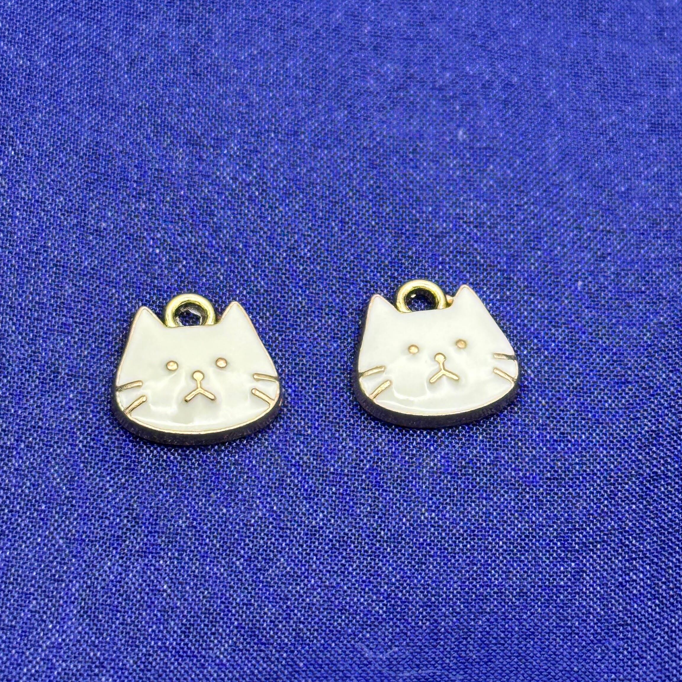 ホワイト×ゴールドのエナメル仕上げで、かわいらしい猫の顔がデザインされたアクセサリーパーツ。小ぶりで扱いやすく、ピアスやブレスレット、ネックレス、ペンダントトップ、キーホルダーなど、さまざまなハンドメイド作品に活用いただけます。
