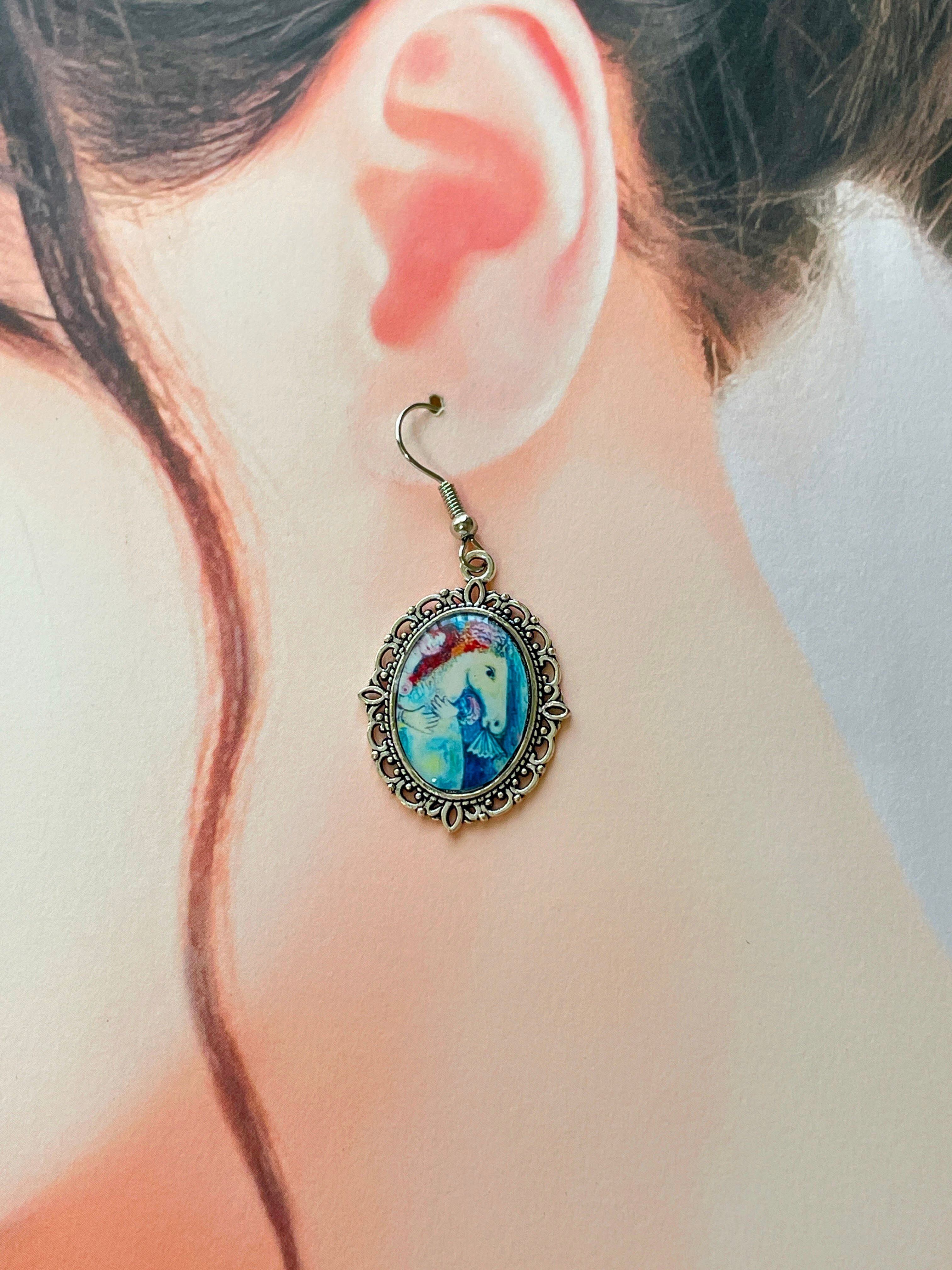 幻想と愛の画家、マルク・シャガールの名作《馬の上に乗った女》をモチーフにしたアートピアスです。鮮やかな色彩と幻想的なタッチで描かれた女性と白馬は、身につけるだけで胸元にロマンチックな世界を広げてくれます。