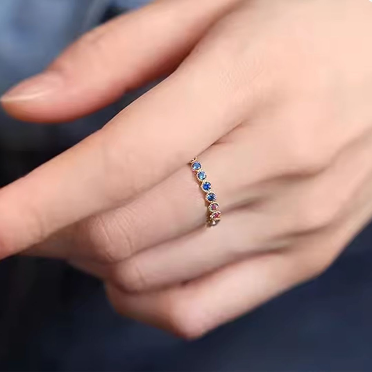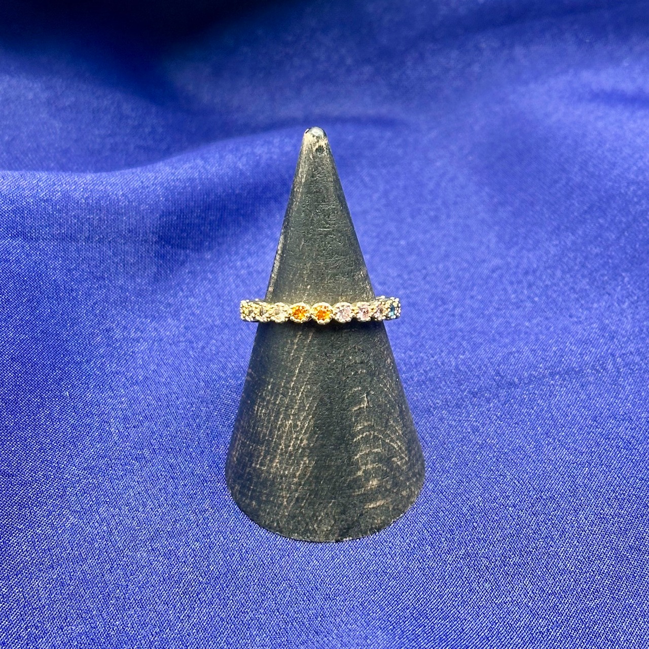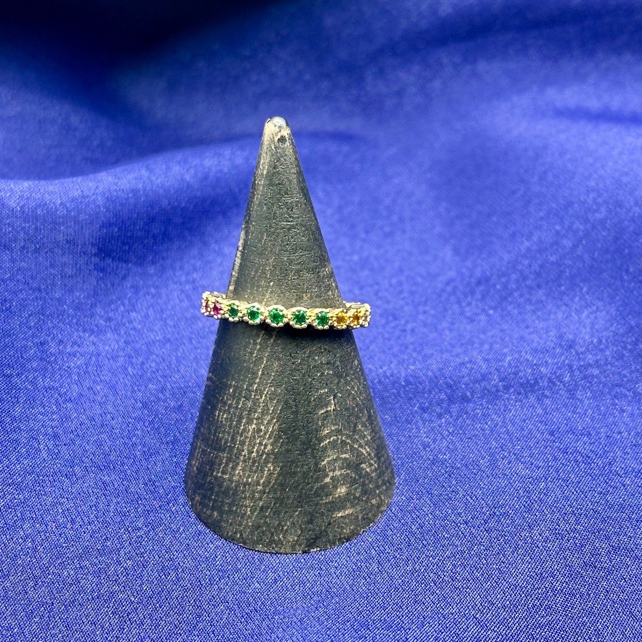 虹のように鮮やかなストーンをぐるりと並べた、華やかなエタニティリングです。