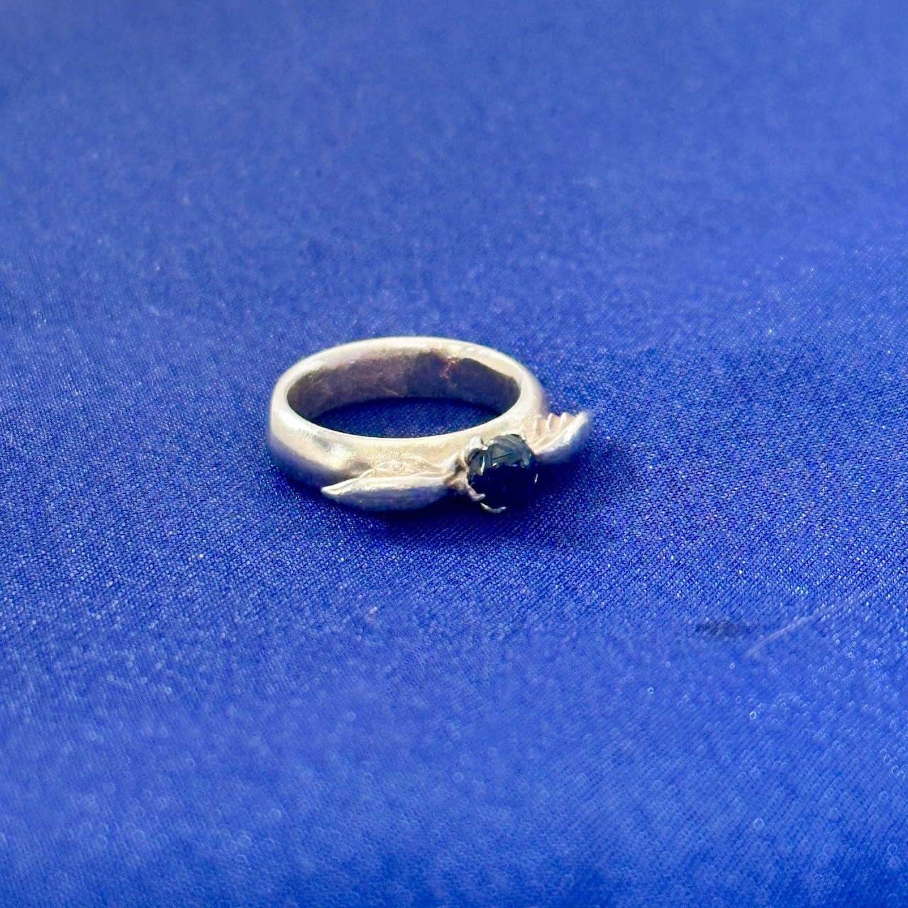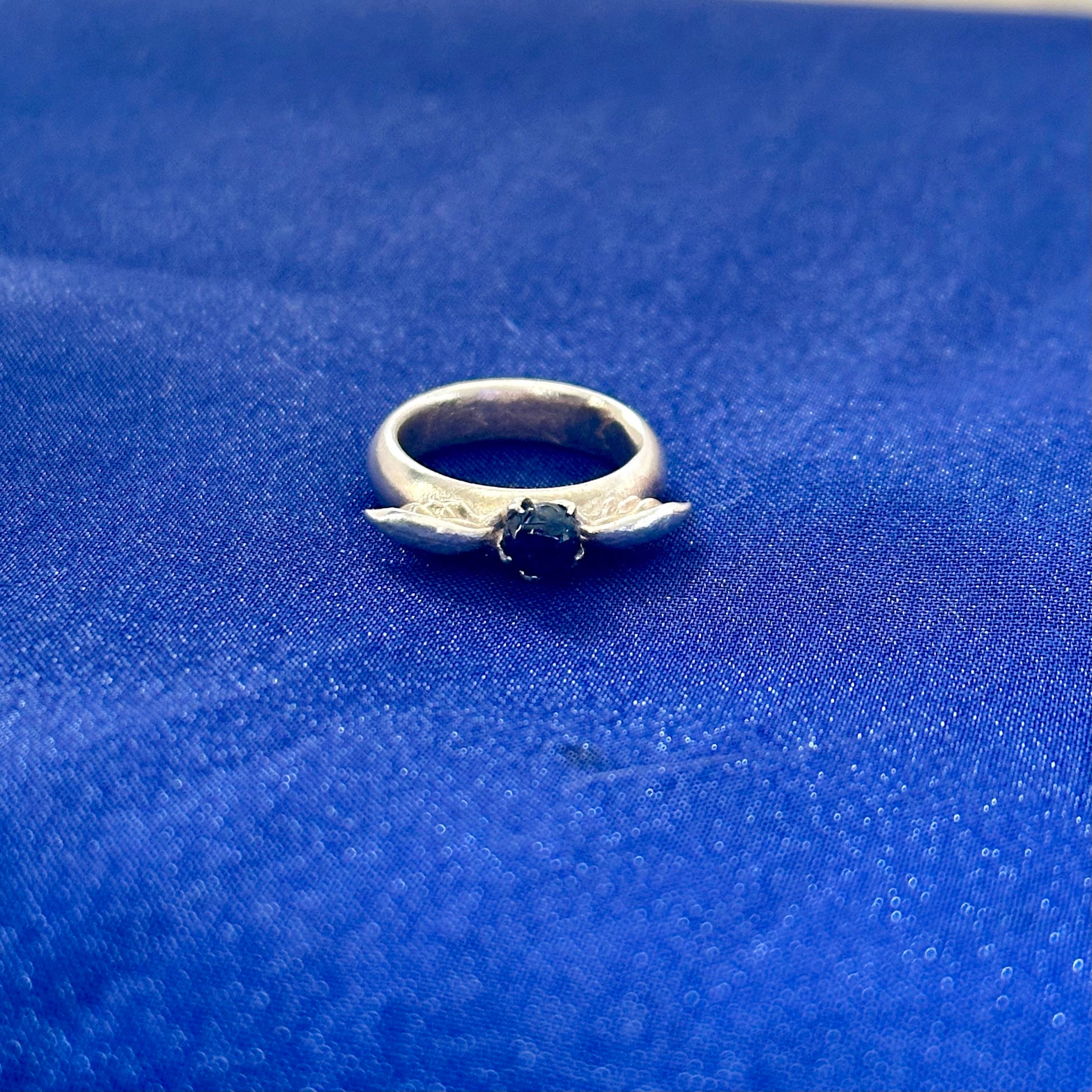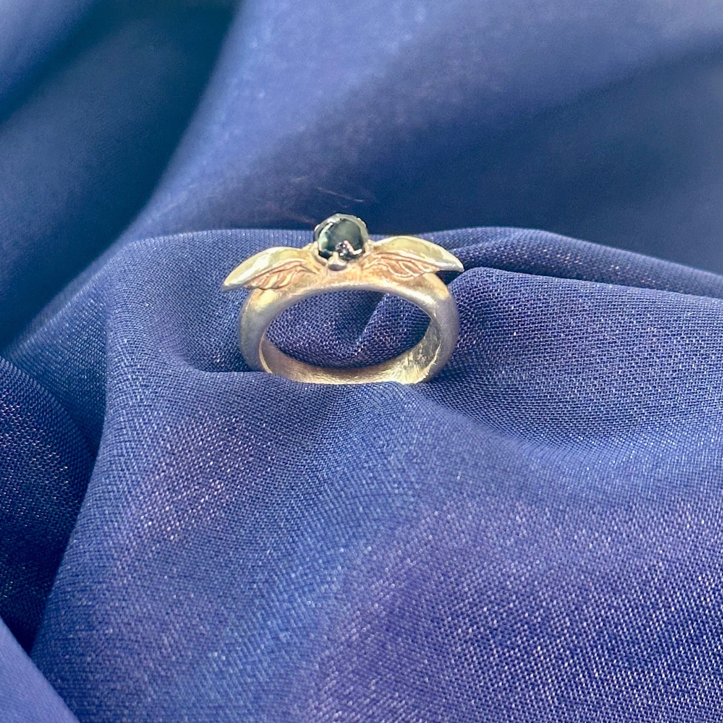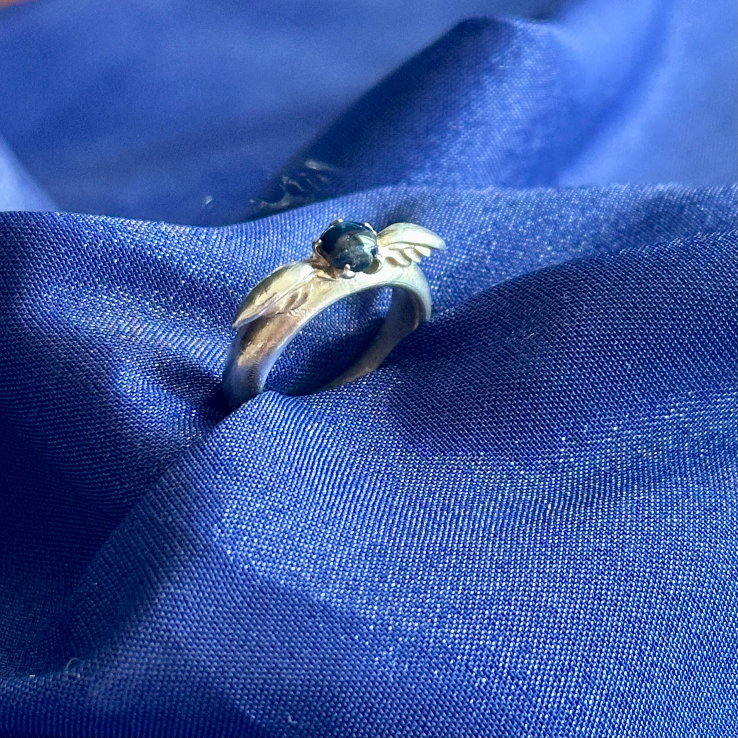 深い星空ブルーを宿すサファイアを、優美な翼モチーフで包み込んだ小さなベビーリングサイズのジュエリーです。