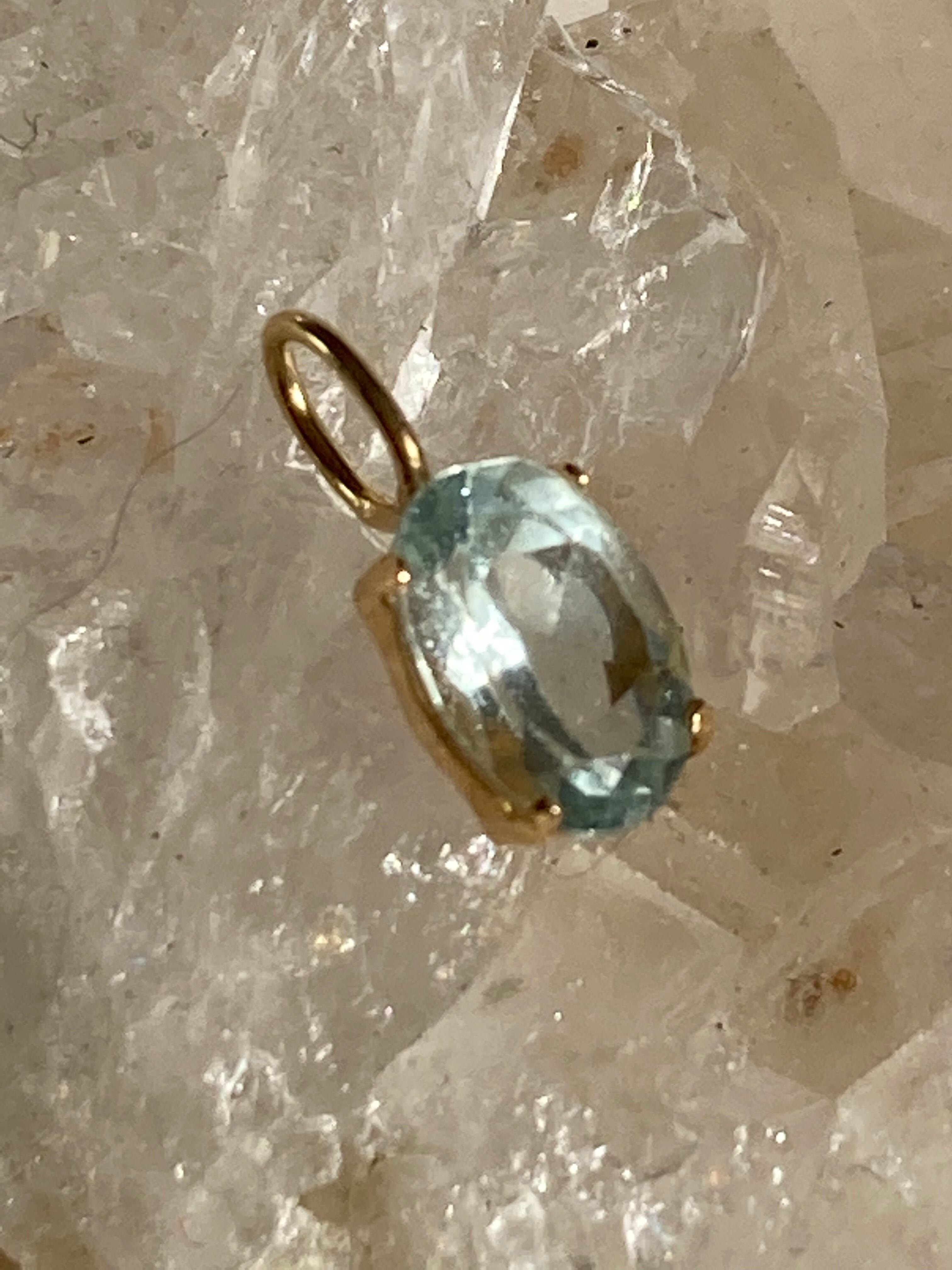 18金のペンダントトップ枠にアパタイトスカイブルーを入れたペンダントトップです。石のサイズ5㎜×3㎜ 清々しい透明感のあるアパタイトスカイブルーです。