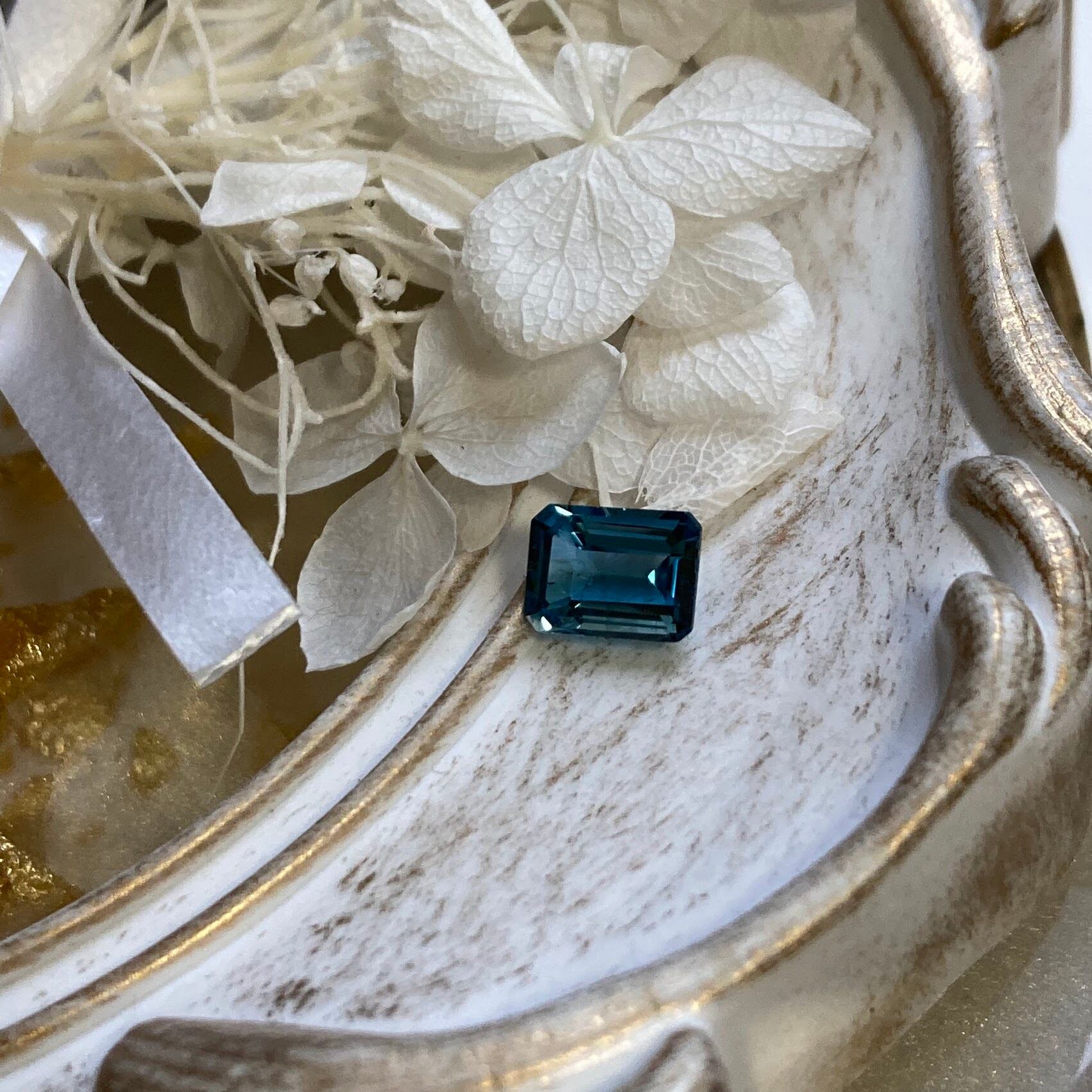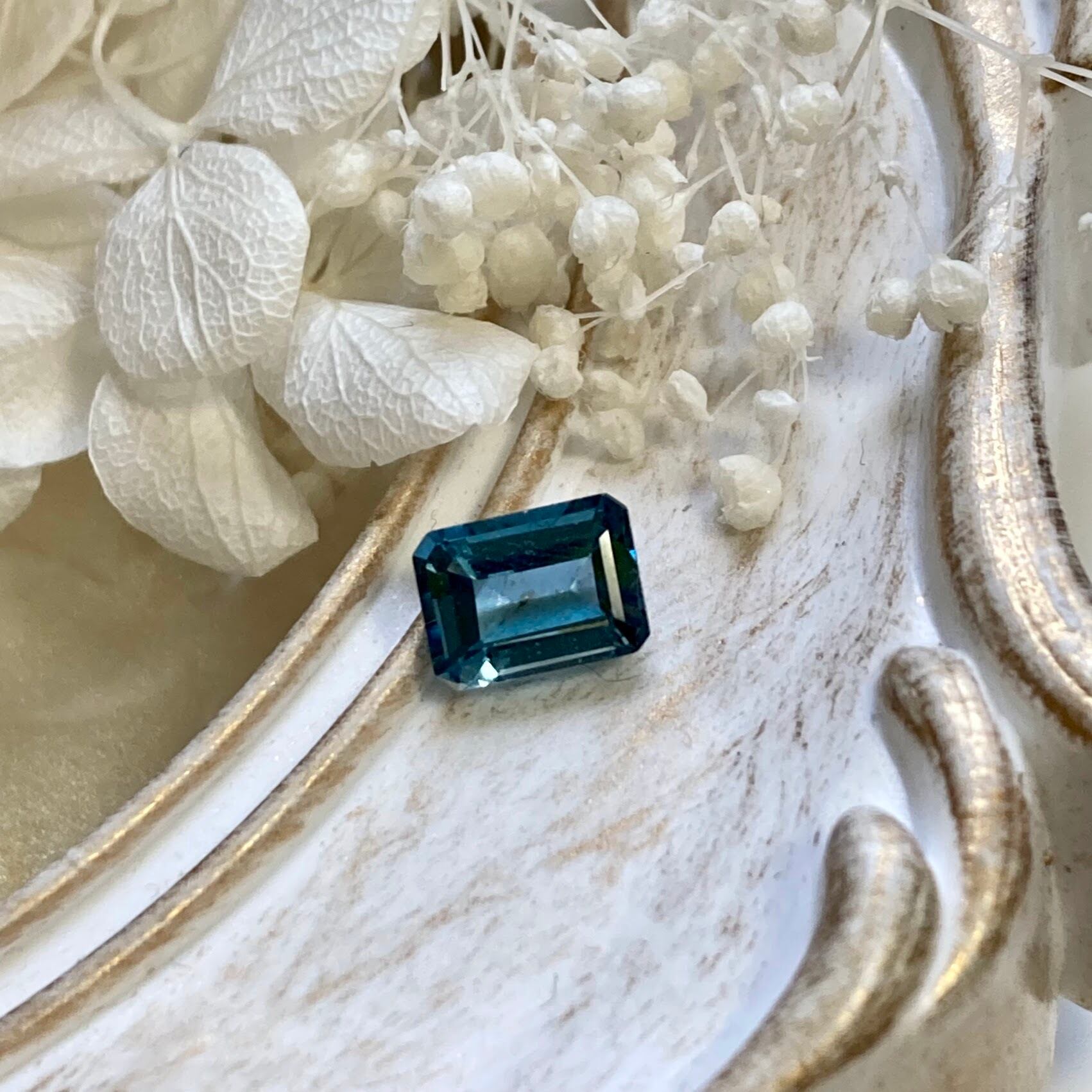 ロンドンブルートパーズのエメラルドカットのルースです。透明感のある青みが吸い込まれそうな美しさです