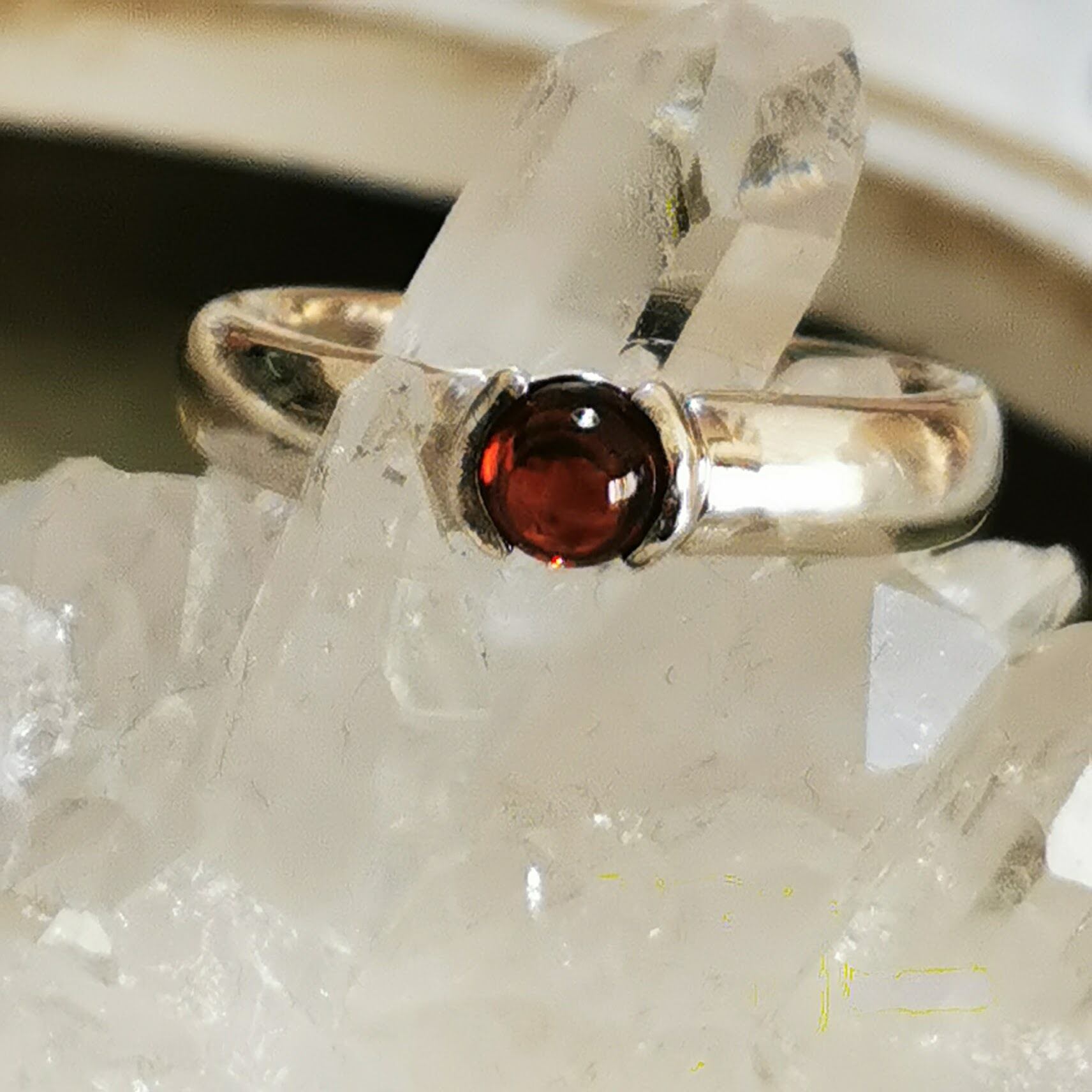 真っ赤なガーネットのカボションカットのぷっくり感を活かして覆輪留めで仕立ててます