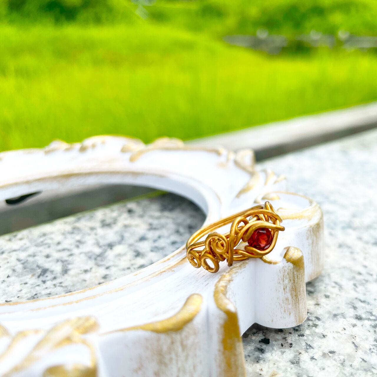 遊び心あるワイヤーの指輪に天然大粒ガーネットを閉じ込めました