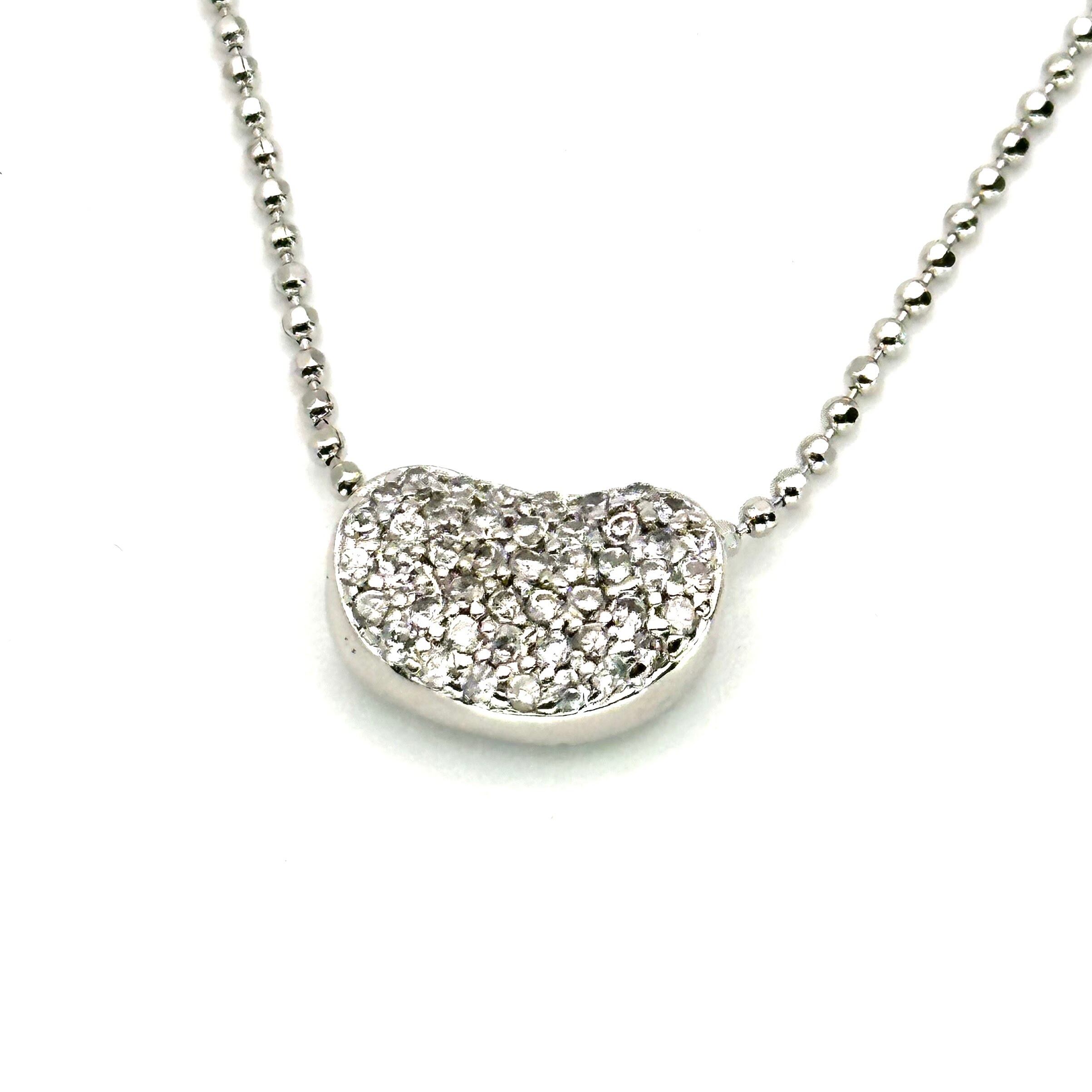シンプルなデザインながらも存在感のあるネックレス。ひとつひとつのビーンズモチーフには、輝くクリスタルが散りばめられており、光を受けてきらめきます。カジュアルなコーディネートにも上品さをプラスすることができるので、デイリーユースにぴったりです。豆が芽生える瞬間や、光を浴びて輝くビーンズを見て、自由で軽やかな気持ちを表現しました。ビーンズモチーフの形状やシルバーの輝きは、その自然の美しさを再現したものです