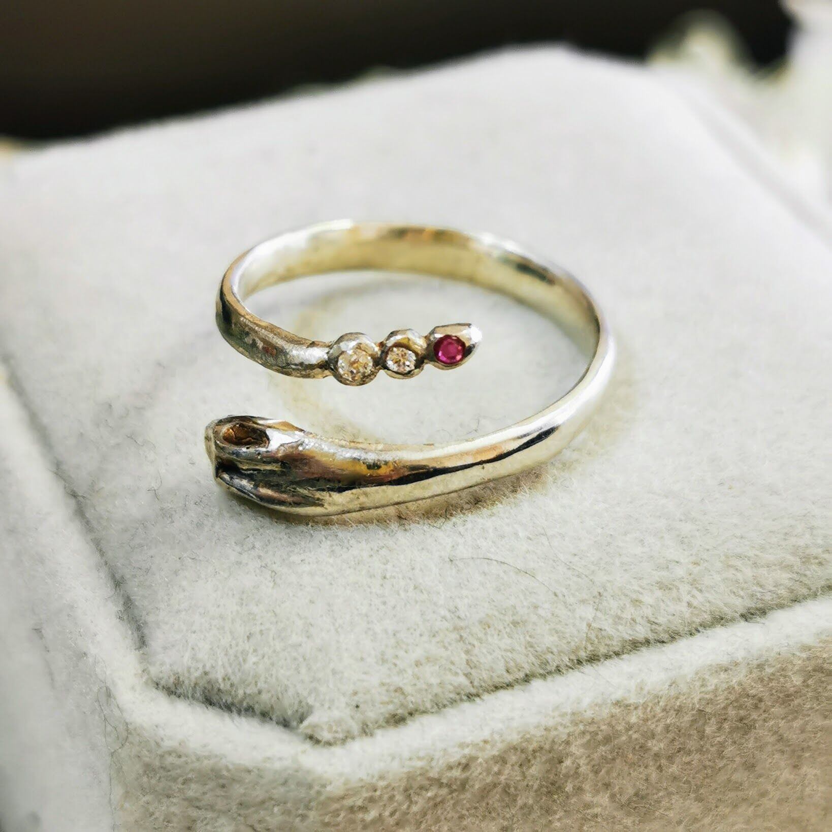ルビーが輝く、エレガントなスネークリング。シンプルでありながら華やかさも兼ね備えたデザインです。スネークモチーフのカーブラインが指に沿ってフィットし、指先をグラマラスに演出してくれます。サイズフリーなので、指の太さに関係なく調節できます。真実の愛や情熱を象徴するルビーの輝きが、あなたの指を美しく彩ります。ひとつひとつ丁寧に作りました。熟練の技術と芸術的なセンスが生み出す、高品質なジュエリーです。