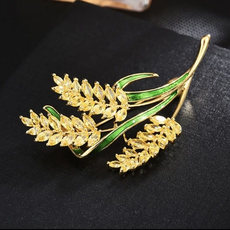 小麦をモチーフにした幸運を招くブローチ。コートや帽子、バッグなど、さまざまなアイテムに取り付けることができる品です。胸飾りのモチーフとして使われる麦の穂は、農耕を司る女神ケレスのシンボルであり、豊饒や大地の恵み、また母性愛を含む心の豊かさを象徴しています