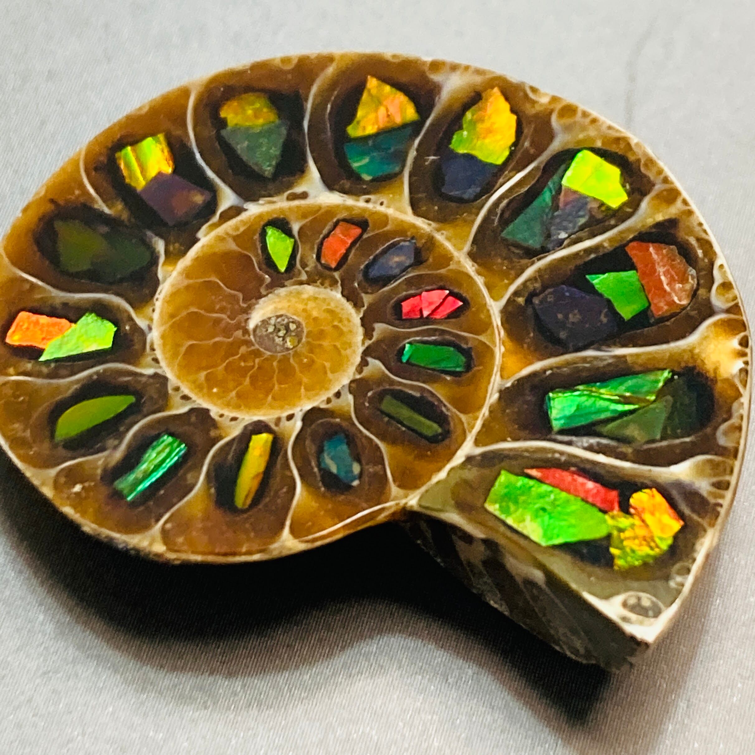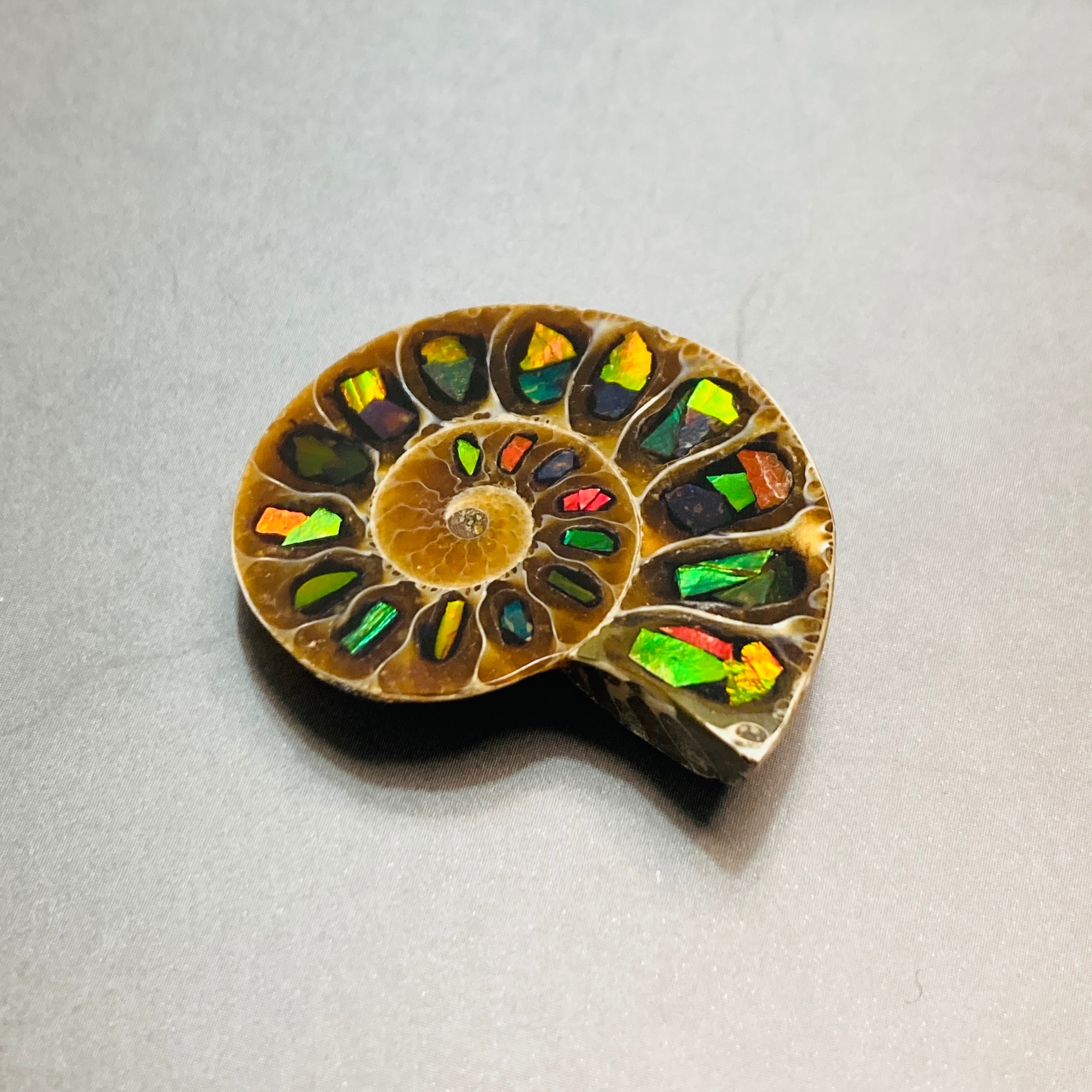 一つのアンモナイトを真ん中からふたつにスライスし、アンモナイトの模様に沿って削り、モザイク状の宝石アンモライト を埋め込み、表面を平らに磨き、樹脂加工で仕上げられています。高価なアンモライトと安価なアンモナイトを組み合わせることによって、お求めやすい価格でアンモライトの美しさを楽しめる商品です。アンモナイトの名前の由来は、古代ローマのアモン神の角に似ていることから「アンモナイト」と名付けられたと言われています。
