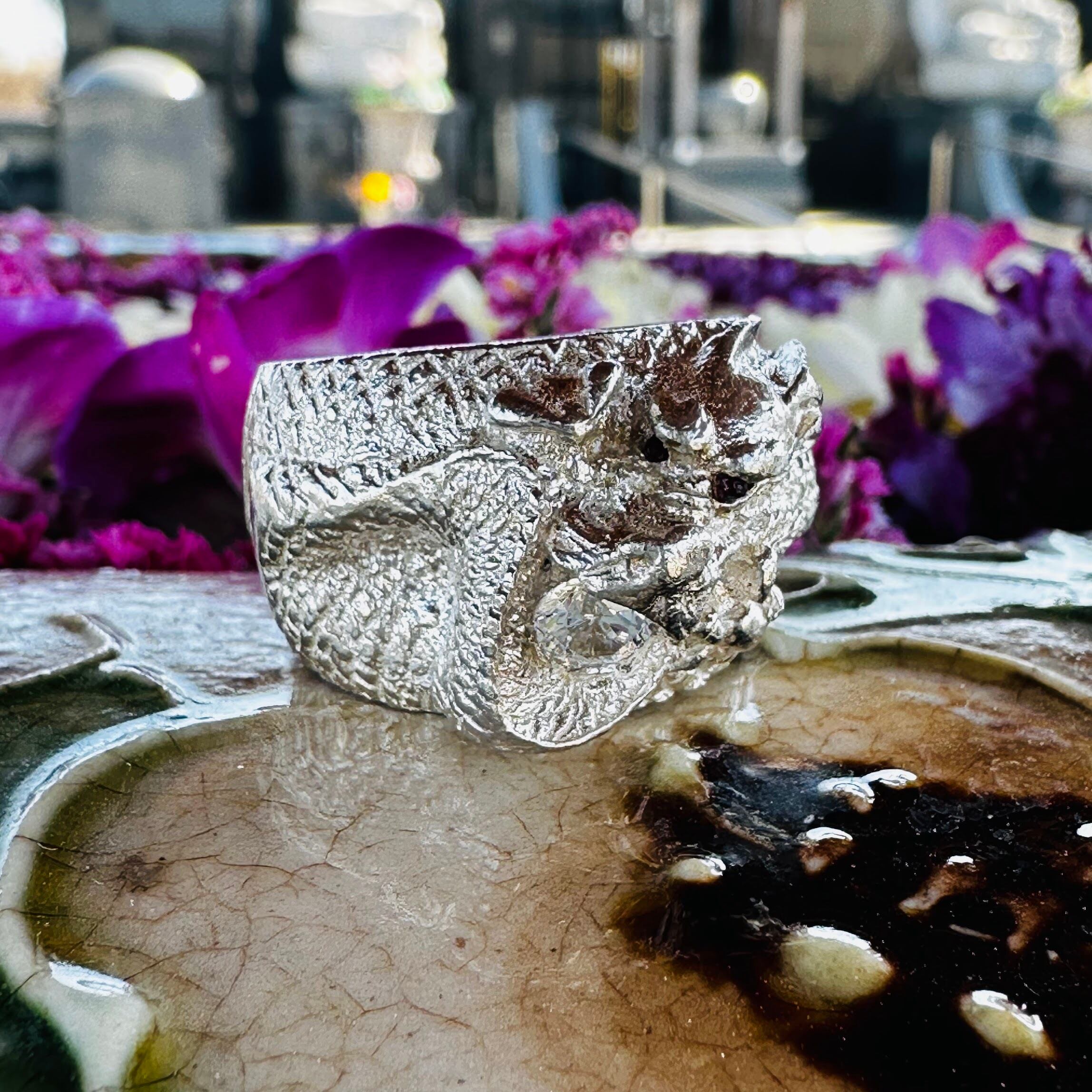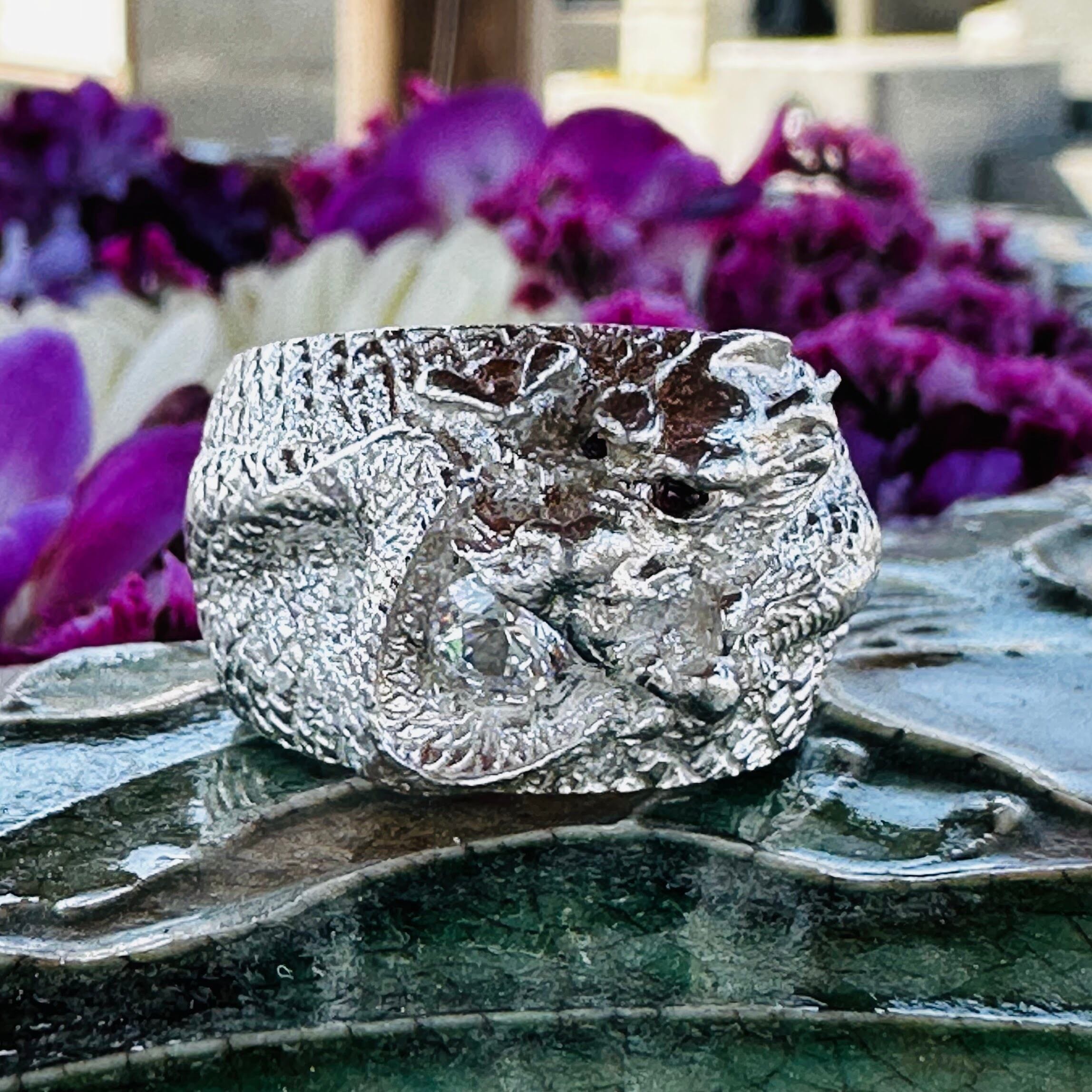 指輪の重さが33gもある龍の指輪です。龍は最高の運気があるという事でシルバーをあえて薄くせずに作りました。素材に重量感がある為指輪も光輝いています。