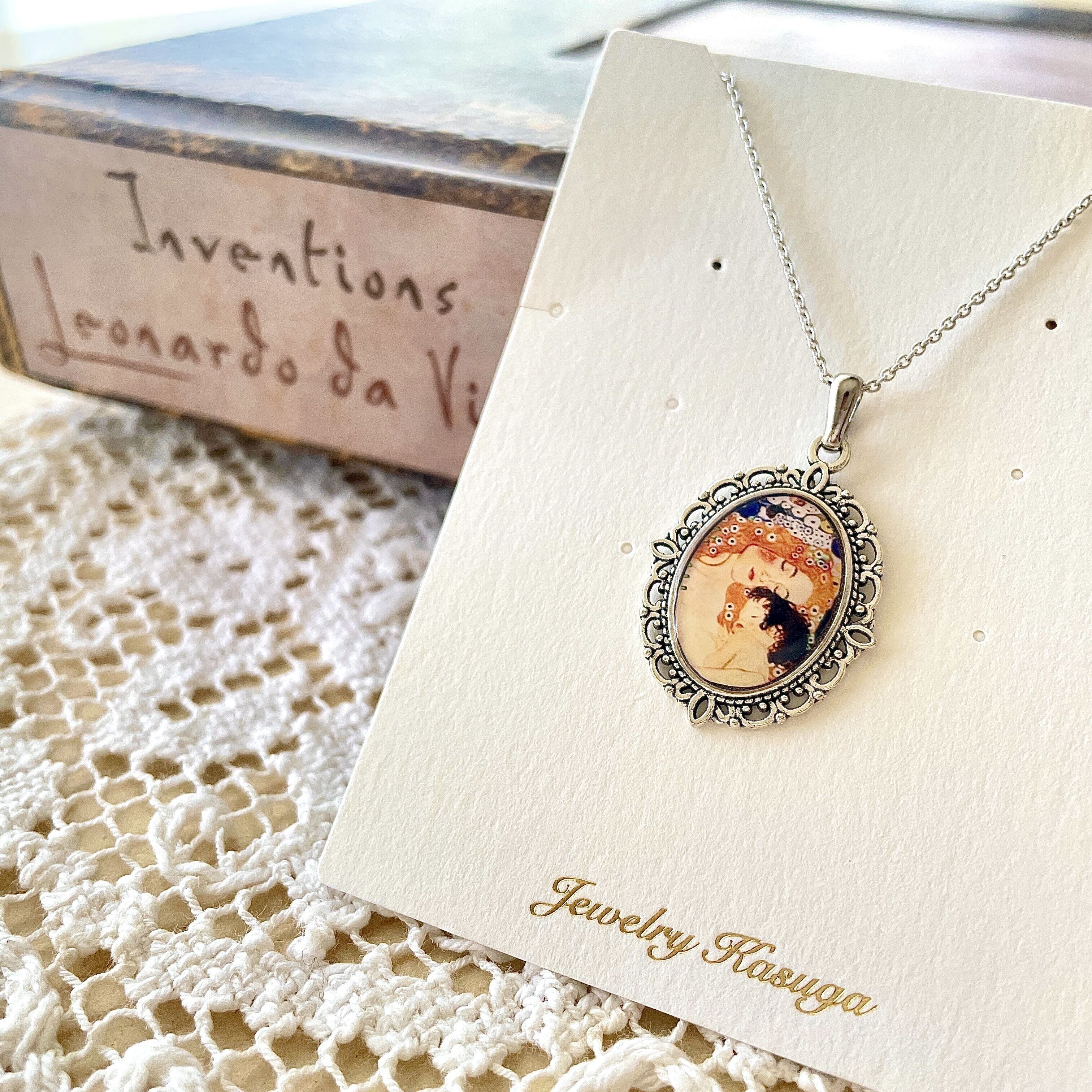 こちらのネックレスは、オーストリアの画家グスタフ・クリムトの名作「人生の三段階」をモチーフにしたエレガントなネックレスです。この作品は、人生の段階を描いた感動的な絵画であり、その中の母と子の温かい抱擁シーンが美しくその絵を忠実に再現しました。