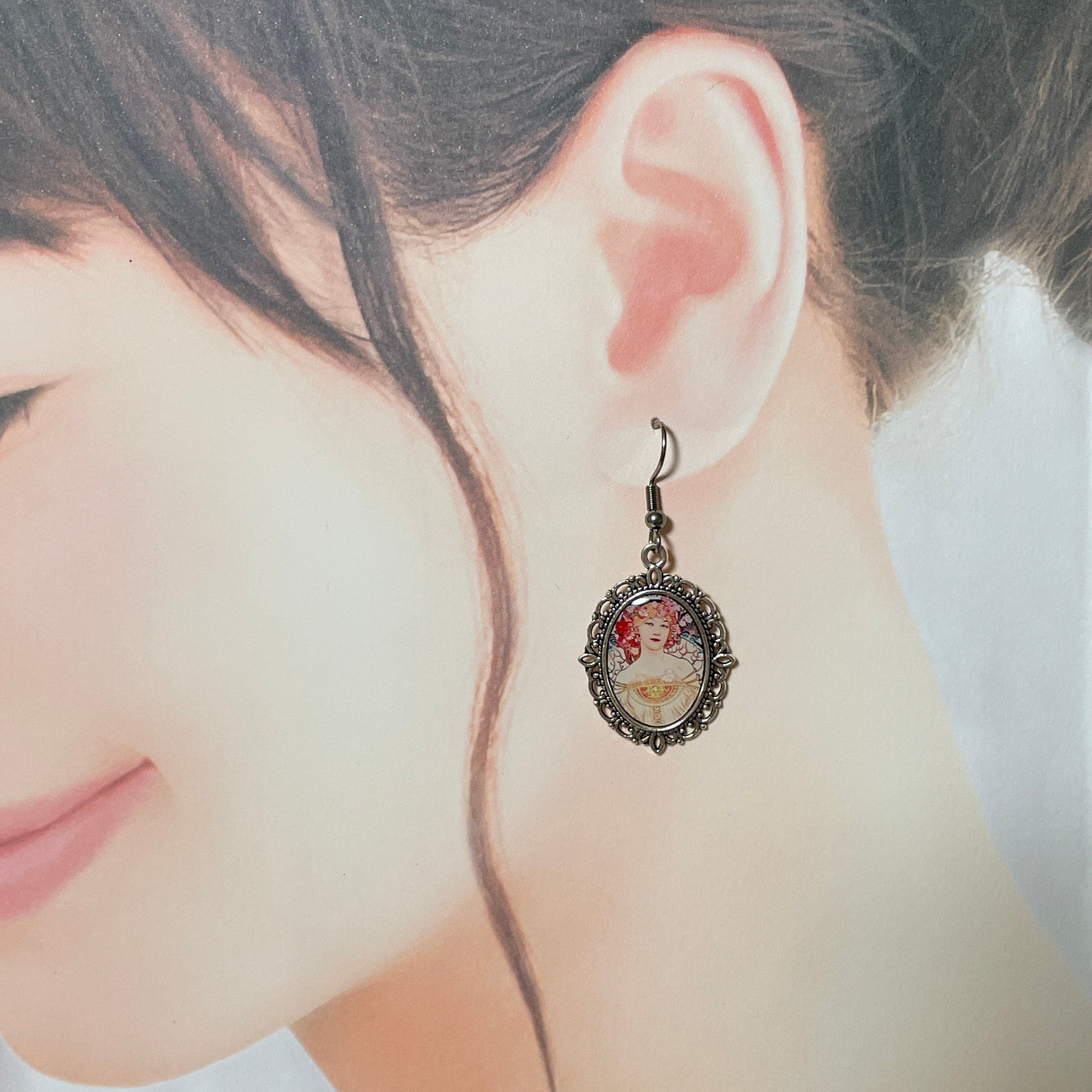 こちらのピアスは、アール・ヌーヴォーの巨匠アルフォンス・ミュシャの名作「黄道十二宮」と「夢想」を再現しピアスにしたエレガントなアイテムにしました。二つとも美しく繊細な女性像が描かれたデザインが、アンティーク調のフレームで際立ち、優雅でクラシカルな雰囲気を演出しています。