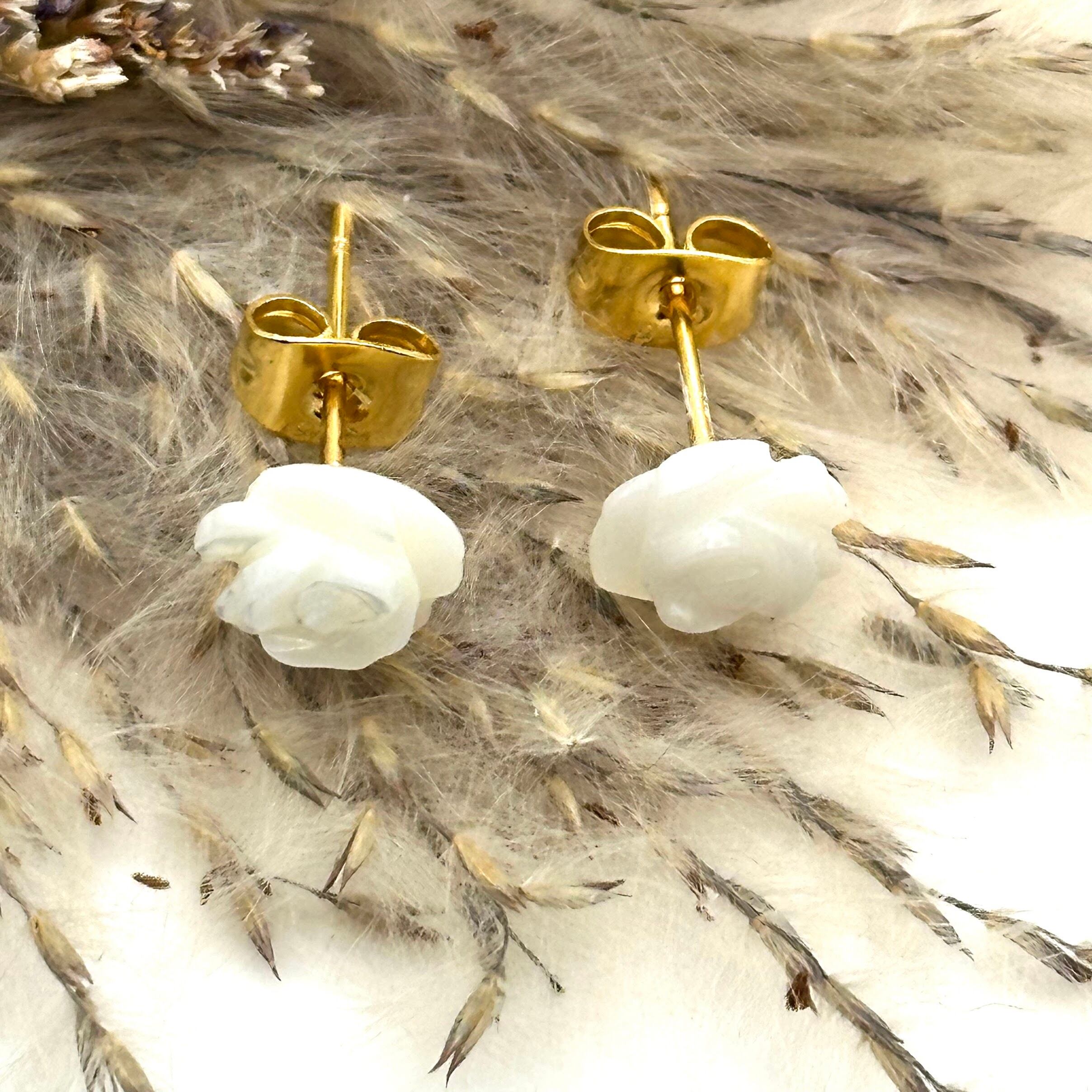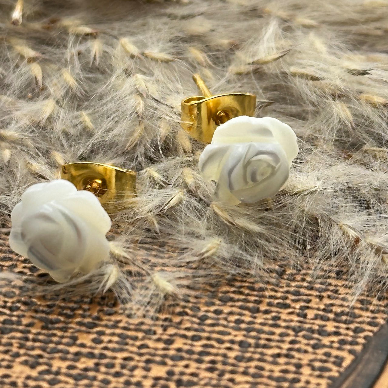 マザーオブパールを美しく薔薇の形に彫刻したピアスです。優しい輝きを放つマザーオブパールが、耳元に上品さと清楚な印象を与えます。光の角度によって変わる繊細な輝きが華やかさをプラスしてくれます。シンプルなデザインながら、細部までこだわり抜かれた彫刻が魅力的で、優雅で洗練された一品となりました。