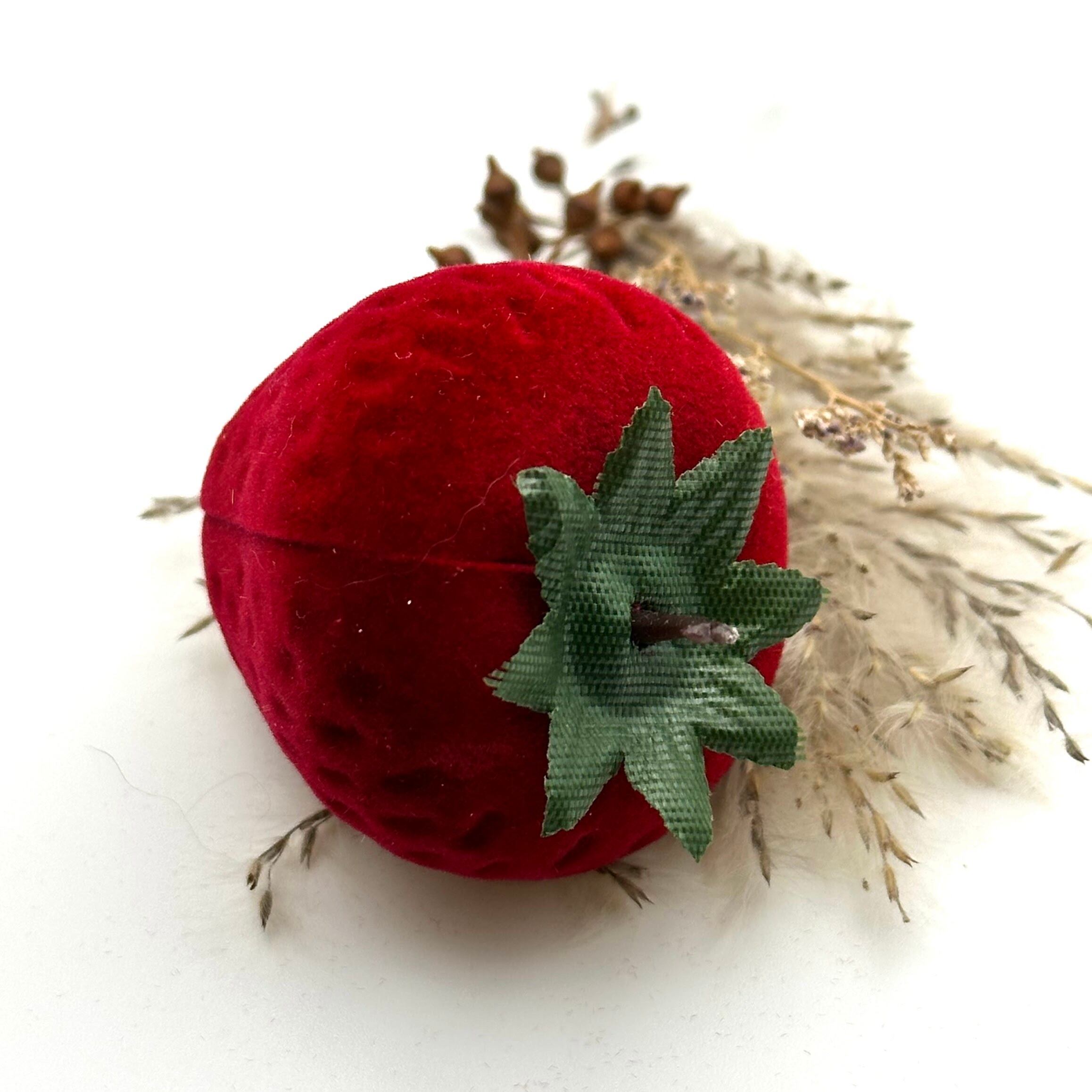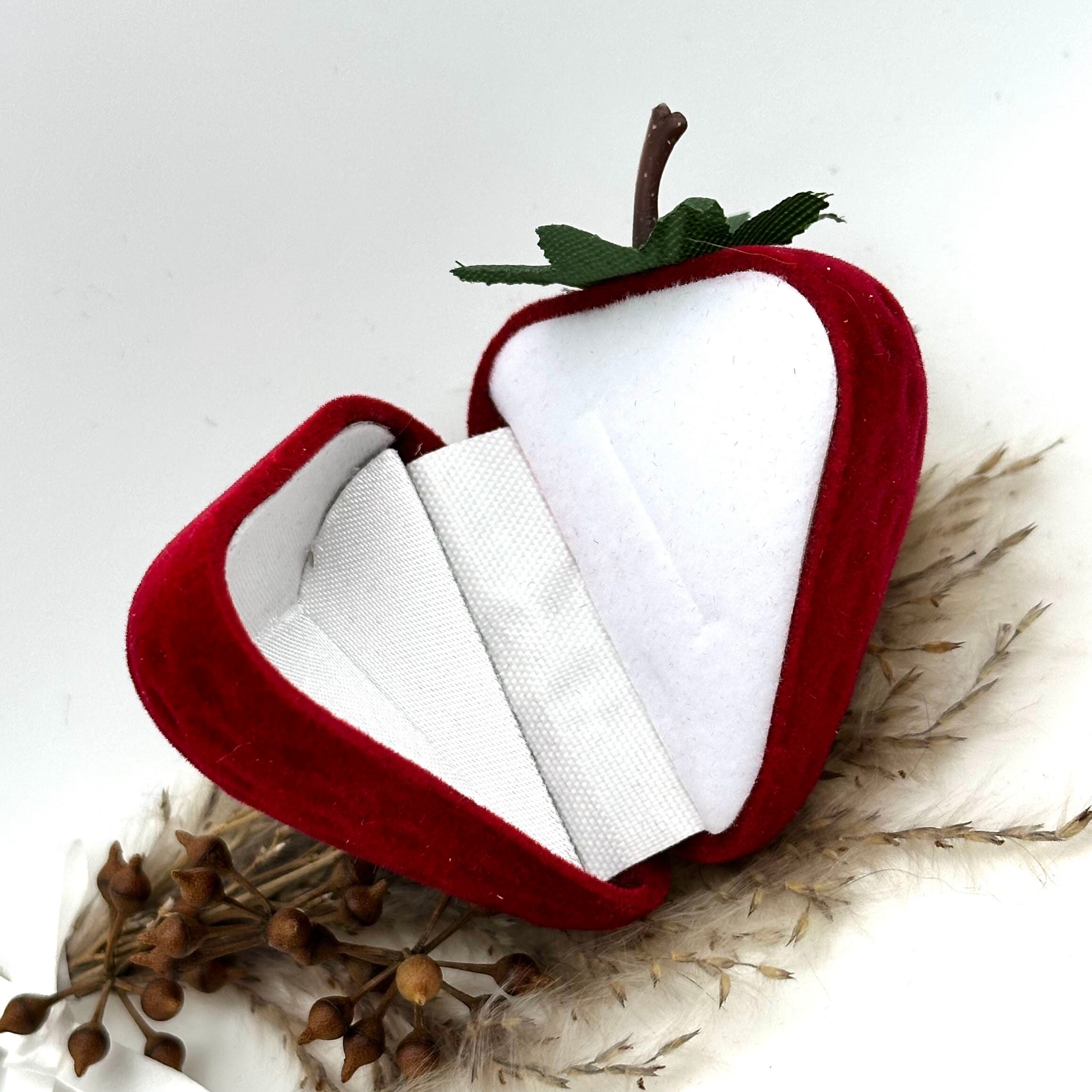 まるで本物のイチゴのように愛らしいデザインのリングボックスです。鮮やかな赤いベルベットがイチゴの質感を再現し、ヘタ部分もポイント。