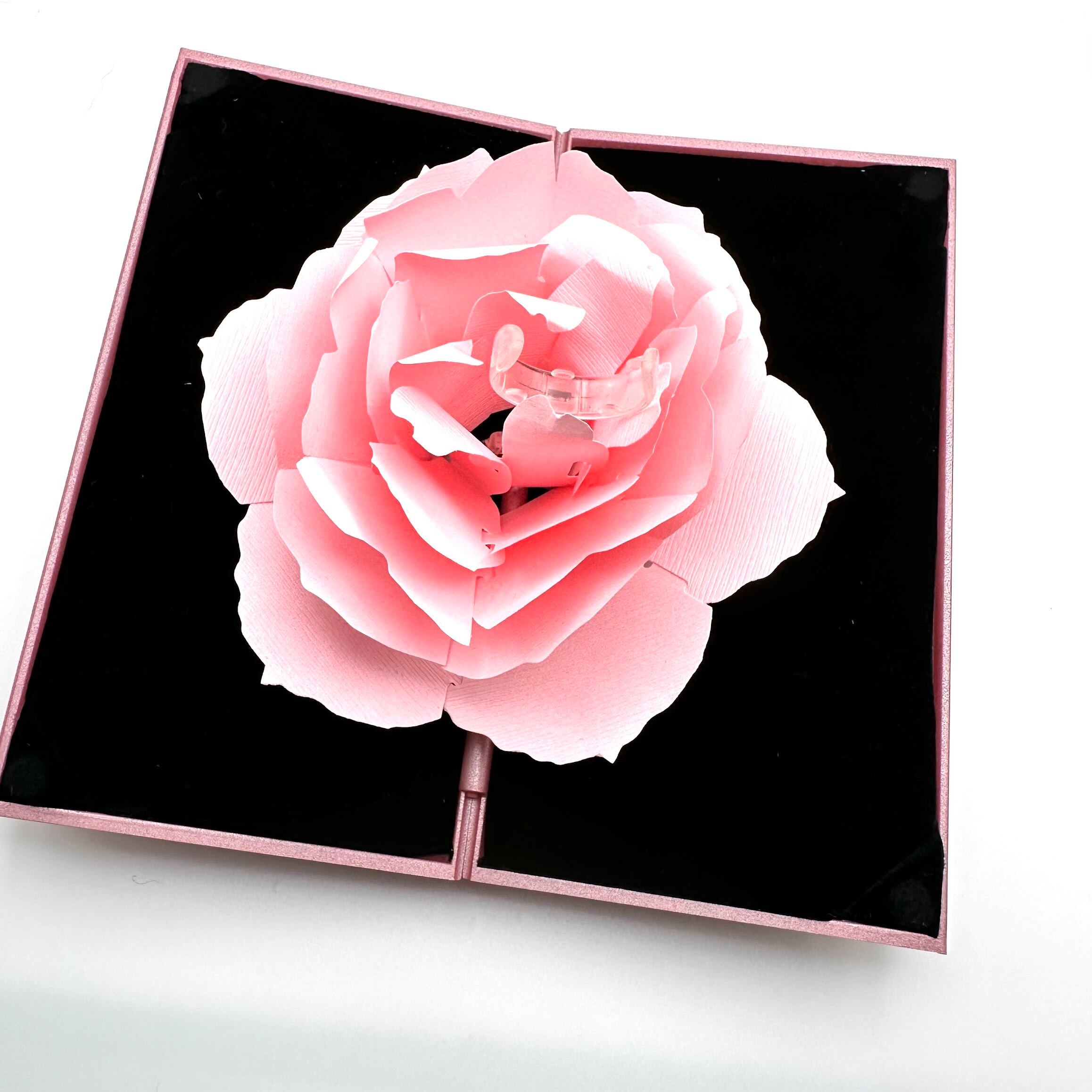 華やかなピンクのローズが美しく咲き誇るなジュエリーボックスです。バラの中央部分にリングを差し込むと、まるで花の中心にリングが飾られているかのような演出が楽しめますよ。大切な指輪をまるで花の一部として見せることができ、特別なシーンでのサプライズにも最適です。