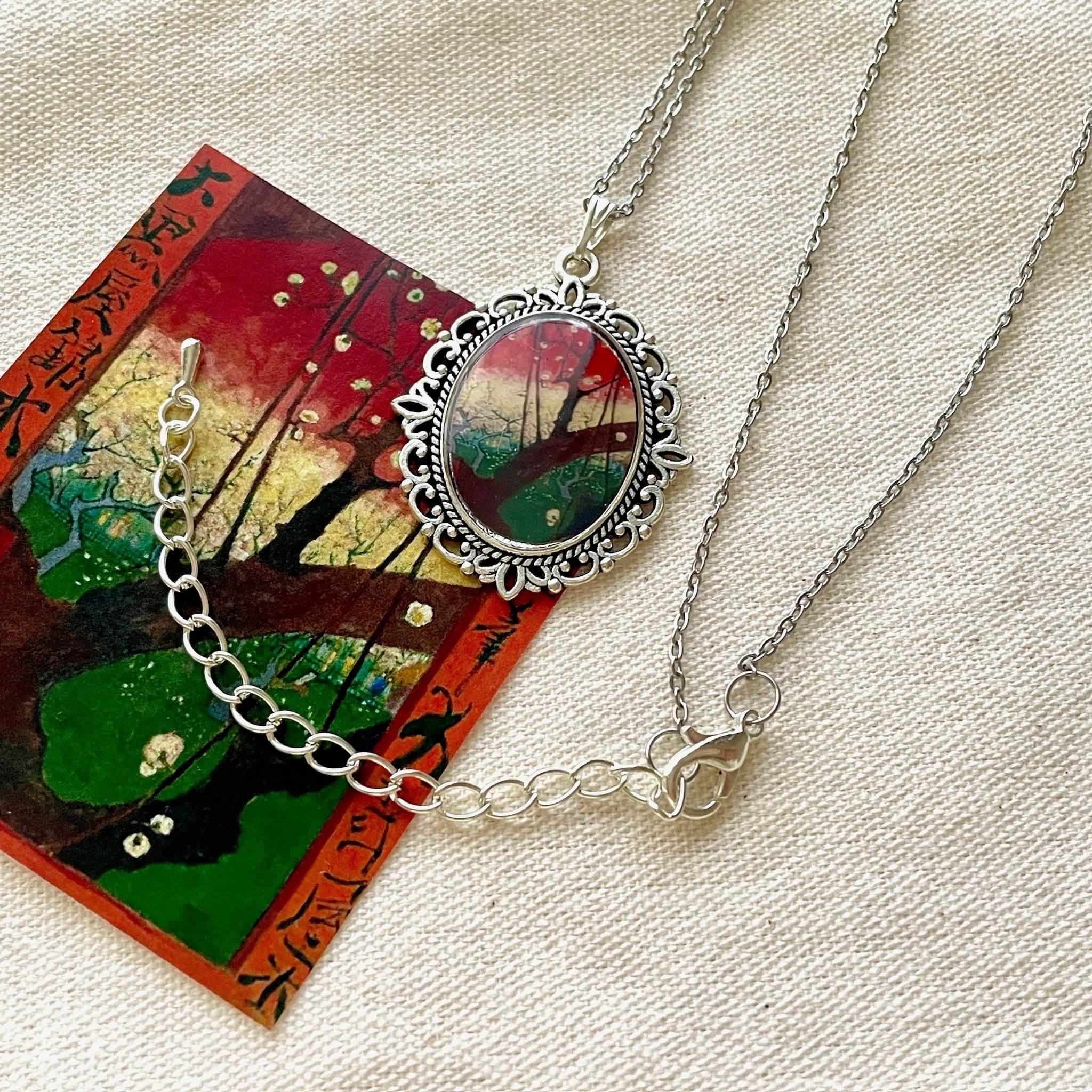 西洋と東洋の美が見事に融合したアンティーク調ネックレスです。ゴッホが日本の浮世絵、歌川広重の「梅」を模写した絵を、ペンダントに美しく収めました。情熱的な赤と優雅な緑のコントラストが印象的で、梅の枝が織りなす繊細なシルエットが、どこか幻想的な雰囲気を醸し出しています。