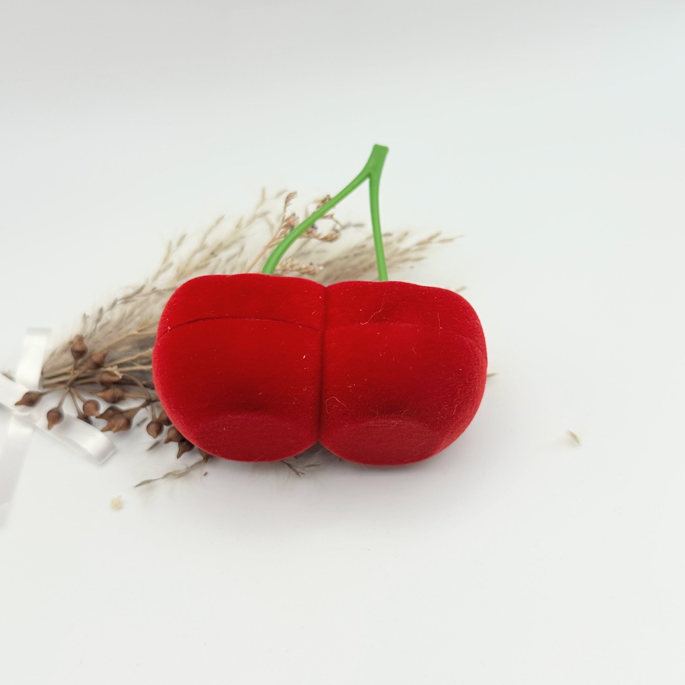 まるで本物のさくらんぼのように愛らしいデザインのリングボックスです。鮮やかな赤いベルベットがさくらんぼの質感を再現し、ヘタ部分もポイントになってます。