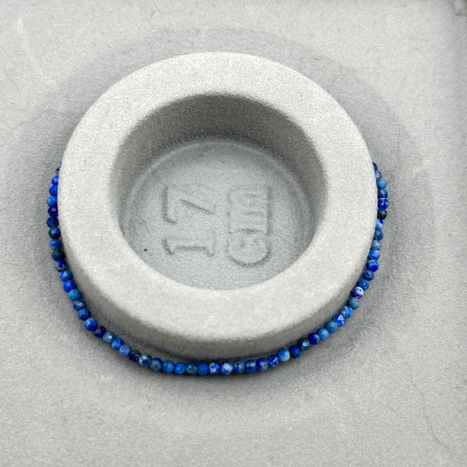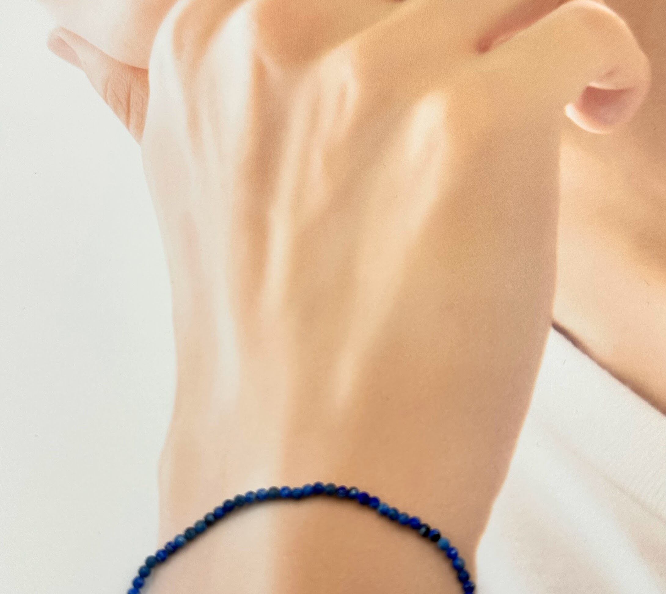 深く澄んだブルーが魅力のラピスラズリを、繊細なカット2mm玉で仕上げた極細ブレスレット。軽やかで華奢なデザインは、手元にさりげない高級感をプラスし、右手につけても邪魔にならず快適な着け心地。シンプルだからこそ、どんなコーディネートにも馴染み、重ね付けしても上品な印象に。ラピスラズリは古来より「幸運と成功の象徴」とされ、大切な願いを込めて身につけるのにぴったりなパワーストーン。毎日使えるエレガントなブレスレットで、さりげないおしゃれとパワーを手元に取り入れてみませんか?